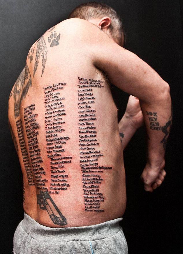 43 летний британский военнослужащий Шон Кларк сделал на своей спине и груди татуировки имен 223 сослуживцев, погибших в Афганистане.