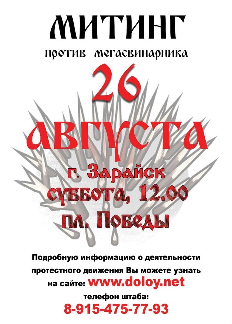 Завтра митинг против свинства на земле Зарайской! Не отсиживайтесь, не прячьтесь за отговорками, не будьте равнодушными и недальновидными, приходите и проявите гражданскую позицию!!! От Вас зависит будущие ваших детей, не дайте его засрать свиньям!!! Вложенные эскизы изображений -------------------- Нет такого совета который мы не могли бы дать...