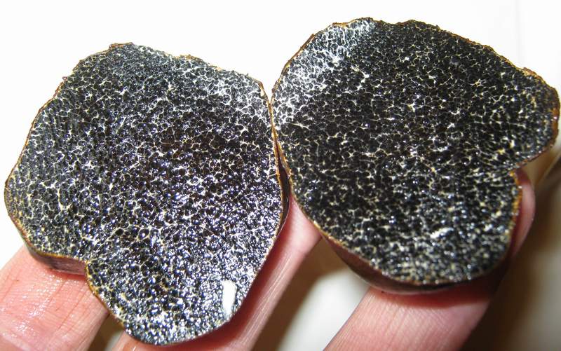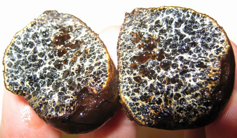 Рыбачил почти месяц,немного наскучило,решили скататься с женой за грибами. Поиск вели исключительно по посадкам. Исколесили порядком,но найдено было очень небольшое количество подберёзовиков,подосиновиков и других. И вот,в очередной посадке наткнулся на странного вида гриб...,ранее таких никогда не встречал.Чёрный,формой схож с грибом дождевиком(перезрелым). Махнул залежалую листву,а там...-грибы будто-бы вывалились из земли. Все грибы этого вида были найдены на небольшом участке! Вспомнился недавний просмотр передачи,как в Европе ищут грибы с помощью собак - по форме очень схожи,вот и решил задать вопрос,может кто подскажет,неужели Трюфель??!! Выдаю фото(со вспышкой) в мокром и сухом виде. Подробно описываю: Липецкая... Форма: неровный картофель. Размер: мелкий,средний картофель. Цвет в сухом виде: тёмно-коричневый,(шоколадный) Цвет(на разрезе): чёрный,с множественными прожилками белого цвета. Излом: похоже на излом сваренной печени(извиняюсь...) Запах: тонкий,специфический запах(пожалуй... приятный!) НО более всего удивил ВЕС! : небольшой паковочный пакет(на фото) весит 1кг 900гр.!!! Большая просьба ко всем - пож. подскажите,что за гриб??...,может и не трюфель никакой,съедобен ли данный "материал"?! Заранее благодарен! С уважением ко всем! Сообщение отредактировано peshod: Sep 14 2013, 00:21 Вложенные эскизы изображений -------------------- Иллюзией человек одержим Она-то и есть его истинная правда Все остальные правды-относительны/Флобер/