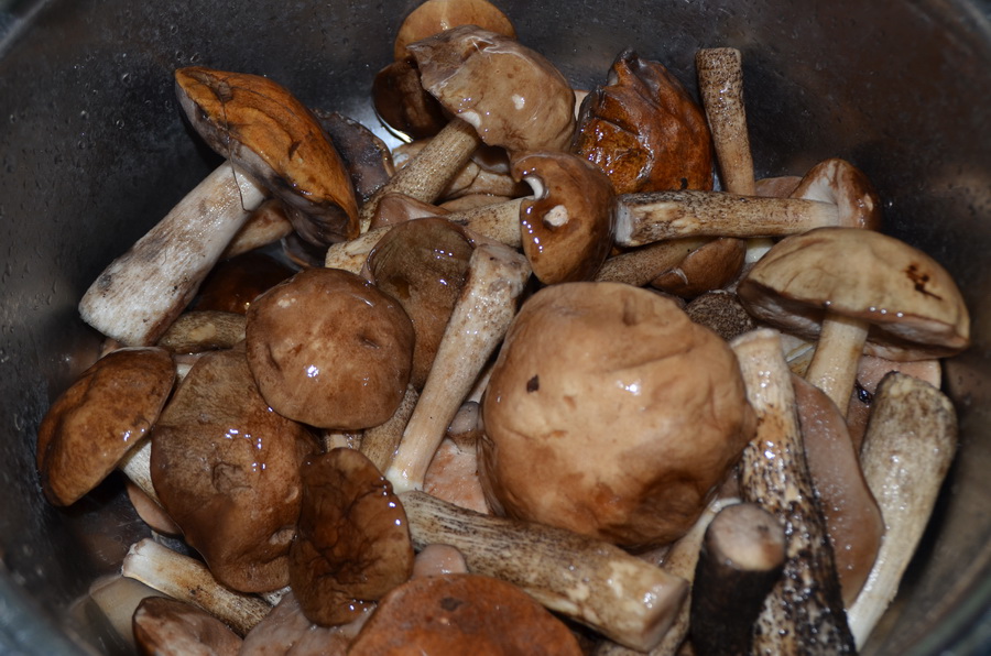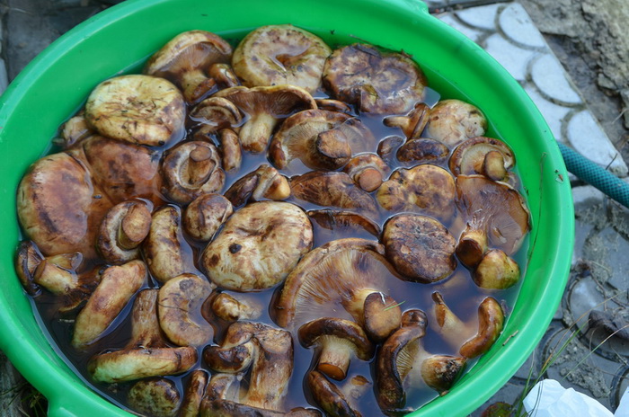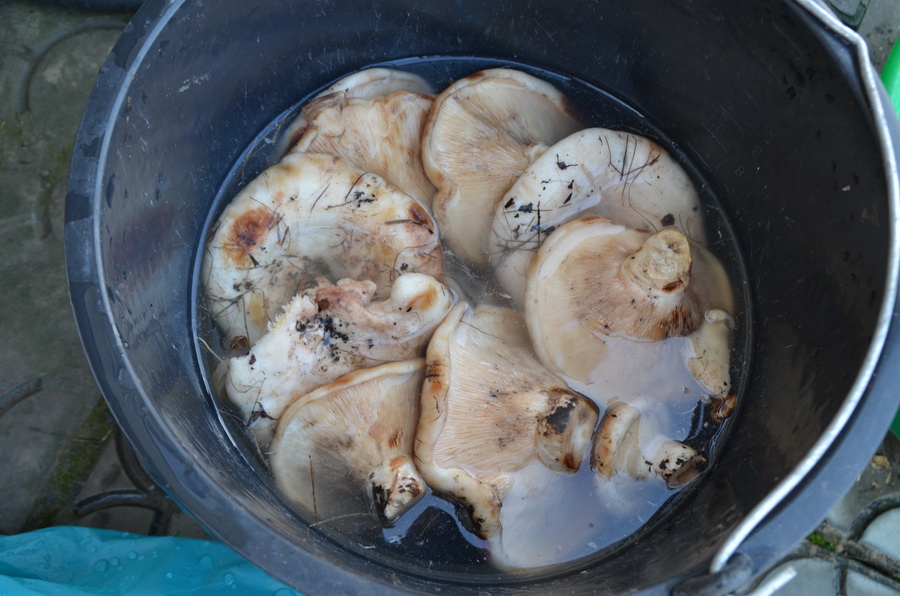 Теперь чуть поподробней о процессе засолки. По приходу домой грузди перекладываются в бачки и заливаются холодной водой, сверху пожится гнёт, для того что бы грибы не всплывали иначе они потемнеют, вода меняется раз в сутки таким образом чтобы в грибы попала свежая вода. Примерно на 4-6 день (зависит от температуры) грибы аккуратно поштучно промывают от лесного мусора и складывают обратно под гнёт, степень готовности гриба определяют на вкус, как только они перестают горчить их смешивают с солью предварительно слив воду из расчёта 50гр соли на 1 кг сырых грибов и раскладывают по банкам, сверху можно положить листья смородины или хрена, они уберегут грибы от плесени, хранить в тёмном прохладном месте.