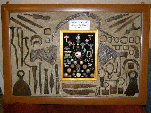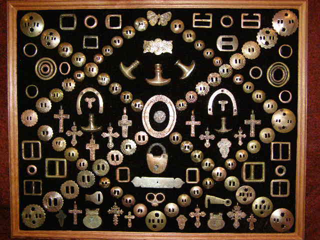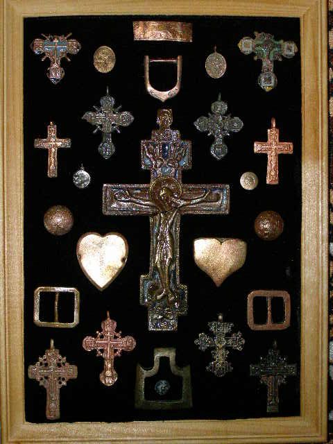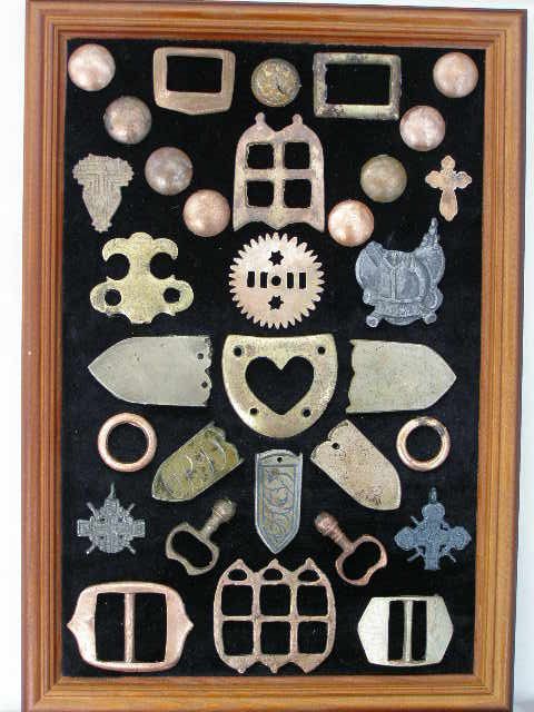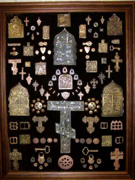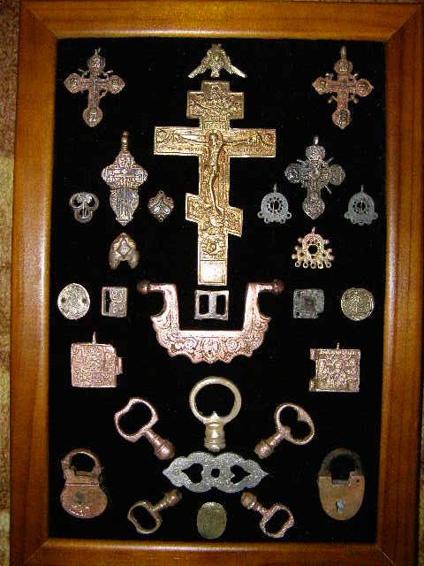 Приветствую всех форумчан! Человек на форуме я новый,но много был наслышан об этом чуде , об общении среди единомышленников по интересам, которого очень не хватает в повседневной жизни. Всё никак руки не доходили, как всегда не хватало времени: сначала купить компьютер. потом подключить интернет, да и с ним я не в дружбе, некогда осваивать. с лопатой и МД лучше справляюсь. Вот и случилось то о чём давно мечтал-я здесь! Хоть и не мастер пера я, но попробую немного рассказать с чего начинал и во что это переросло. а начиналось всё банально просто как и у многих с одной монеты-2 коп. 1924 года,в 1976 году выменял у одноклассника на стакан компота. уж очень она мне понравилась! А потом пошло и поехало, кто просто отдаст, кто поменяет на что то, что на огородах и дорогах находил-история затянула,кругозор расширился, начал собирать и тянуть домой всю старину и военщину, в сарае делать примитивные музеи и т.д... Прошли годы... военное училище.Советская и Российские армии, войны, конфликты, большой перерыв, а мысль не покидала, что у родителей в деревне лежат мои коллекции и что мне очень хочется окунуться в детство, снова заняться любимым хобби с богатым багажом знаний по истории края, да и вообще по истории. Дембель неизбежен-произошло это и со мной! Как будто занаво родился. Новые знакомства, круг интересов по коллекционированию всё больше расширялся. Появились детекторы-перспективы непредсказуемы!!! Вот и мы с другом приобрели свой первый детектор Фишер 1236 7 лет назад, решили заняться поиском старины. Первый год отработали крайне плохо:чермет,цветмет,рядовые монетки и другой хлам не представляющий никакого интереса(для моего друга),сказывалось отсутствие опыта. Не буду описывать о своих похождениях за семь лет и кем я стал за это время. но кроме монет и знаков что я в основном собирал превратился в " Плюшкина", мне стало всё интересно, я себе собрал коллекцию пуговиц.нательных крестиков. царских медалей и жетонов.иконопластики и т.д.,а цветного и чёрного хлама набил полные коробки. Но жизнь к сожалению диктует свои условия и правила. Появились проблемы , путь решения которых лежал через финансы. Решение далось не легко. И вот в прошлом году мне пришлось расстаться со своим любимым "детищем"-почти всеми коллекциями. Но у меня осталось моё любимое хобби-коп и творчество из хлама. Им я начал заниматься ещё на заре своего копа, не зная куда девать обломки и не коллекционный.но всё же старый материал. Не знаю почему, толи от того что бывший военный(а как известно бывших не бывает) и во всём люблю чёткость и порядок, все свои выезды я записывал, делал подробное описание всего найденного,реставрировал,фотографировал, снимал на видео. Сейчас очень горжусь своим богатым архивом,хочу довести его до ума, может что то получится из этого? Есть мысли на эту тему. А сейчас занимаюсь творческой работой. Реставрирую хлам и изготовляю из него различные композиции. Всегда копал по принципу: история должна быть поднята из земли, все находки занять своё место, в государственных или частных коллекциях. в музеях различного уровня,только бы не разрушались и не ржавели под землёй и под водой . Ниже приведены фото моих некоторых ранних и прошлогодних поделок. Я думаю не одинок в подобном занятии?