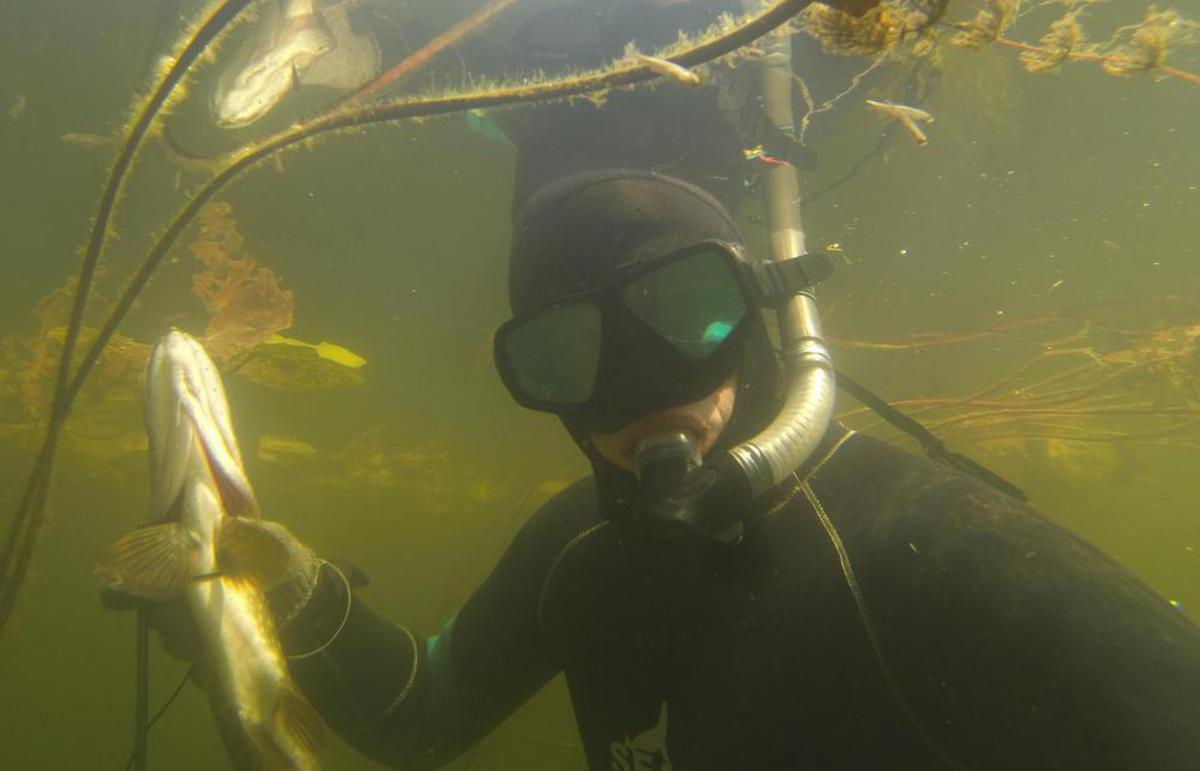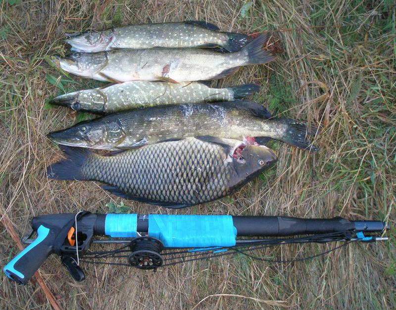 Вчера тоже выезжал на любимую речку, но увы от былого прозрака в 5,5 метров осталось около 1,5 - местами до 2, так как выходной день и выше по течению много отдыхающих, в том числе любители поноситься по узкой речке на гидроциклах. За 9 часов нагрёб ластами около 7 км., кинокамеру включил только чтобы сфотографироваться с первой подбитой щучкой. Обрадовал сазанчик - первый за 4 года охоты (ранее просто не встречались).