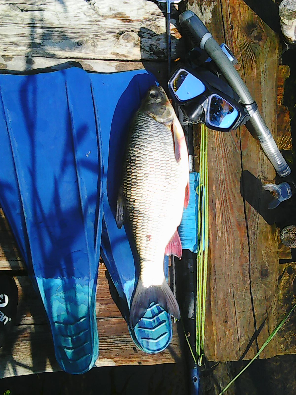Дим классные фотки. Прозрак хороший. Я в субботу на своей любимой речке удачно поохотился на язя, там где мы с тобой стартовали - прозрак был метра 3. Речка сильно заросла - тяжело пробираться, особенно против течения. В этом году реку не травили, рыба зашла - очень много крупного окуня, краснопёрки и язя. Щуки пока крупной не видно, дно пробить тяжело. В воскресенье с товарищем на том же месте поныряли - прозрак метра 1,5. Крупного язя только иногда контур проскакивал - близко к себе не подпускает. Подстрелил двух щучек 1,2 и 1,8 кг. и двух язьков по 700 гр. Когда подстрелил последнего язька, то приключился казус. Вообщем пробираюсь я через самую гущу водорослей и попадаю на небольшую ямку куда вижу заходит язёк. Стреляю в него, подтягиваю линь - вот он уже на расстоянии вытянутой руки и хорошо что я его не взял в руку - из под зарослей вылетает щука килограмма на 3 и атакует язька. Потом немая сцена - щука с язьком в зубах которого она явно не сможет заглотить смотрит на меня, а я неодумеваю от такой наглости. Попытался тихонько сзади её взять за жабры когда она отвернулась, но она оказалась шустрее - бросила мою (свою) добычу, отошла на пол метра, постояла так пару минут и потом видимо поняла что я представляю для неё опасность стартанула в заросли.