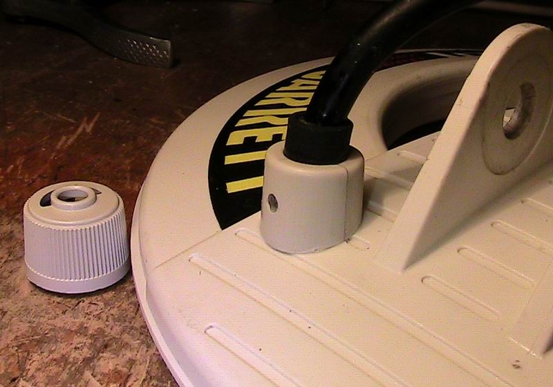 Надо сказать, что вывод кабеля на гарреттовских катушках сделан на редкость примитивно. Так и кажется, что кабель сейчас оттуда просто вывалиться. Да с сам кабель не ахти. При +5 уже окончательно дубеет. Сегодня в очередной раз глянул на это безобразие и решил чуток подправить. Взял ручку регулятора от разобранного когда-то монитора, чуть поменьше той, что на фото, обточил рёбра, чтобы не забивались грязью, распилил пополам, и на супер клей. Через дырочку закачал силикон. Надеюсь, что сразу не отвалиться.