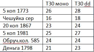 Осенью 2009 купили с сыном Т34 БУ. Как новички очень довольны. Находки поначалу не очень, но через 2-3 выхода пристроились к прибору и находок стало больше, учитывая что походить удалось месяца два с половиной и по выбитым местам. Прибор не сложен в освоении, по- сути прочитал инструкцию и можно все понять, а через два- три выхода и отличать сигналы по звуку. Чешую прибор видит, правда ходим с ДД катушкой обычно. По крайней мере сын нашел две. Для начала я думаю неплохо. Так как надоело таскать за сыном лопату, а денег нет на что-то дорогое, то купили недели две назад недорого еще БУ Т30. Сравнили между собой, практически разницы не заметили, тогда решили сравнить работу катушек моно 9 дюймов 7,5 кГц и ДД10,5 7,5 кГц. в домашних условиях (нашли более-менее нормальное место в квартире ), с неиспользованными батарейками, но пролежавшими дома месяцев пять. Вот результаты, по первому отклику от катушек. Может кто выложит свои, наверняка кто-то проверял в таких же условиях, кто-то покритикует или поругает наверняка, может кто АСЕ 250 также дома тестировал выложит, сравним. Может и будет от этого кому-то помощь в выборе металлоискателя. С уважением ввк.