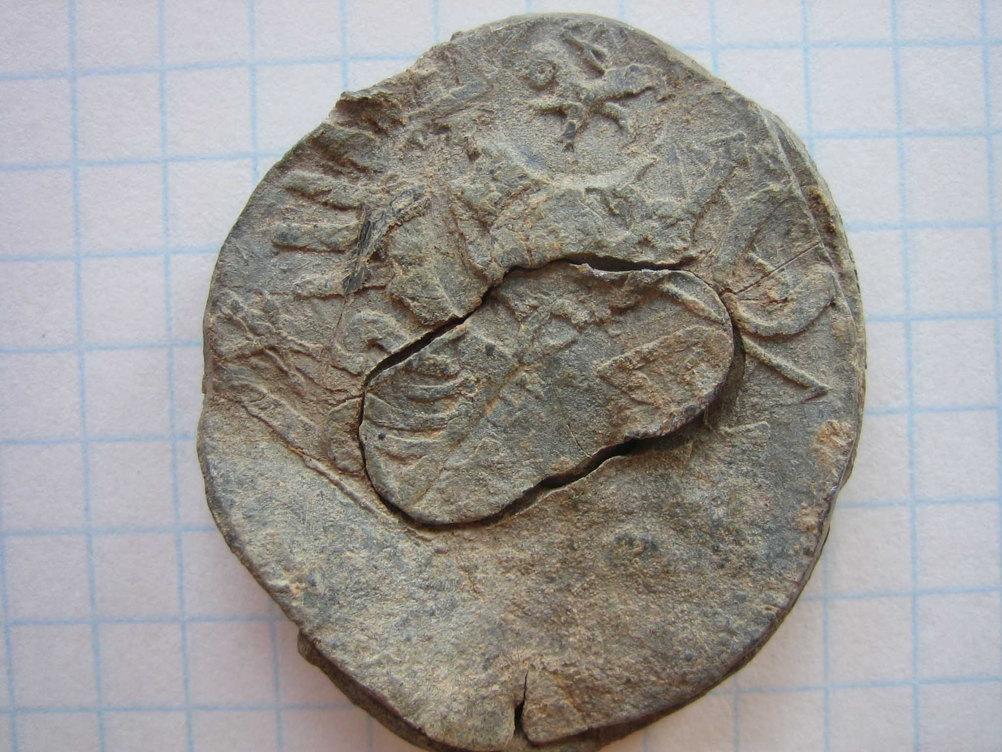 Нашел еще одну. Вот что получилось при свете лампочки. Что интересно герб перевернут к верх ногами по отношению к надписи.
