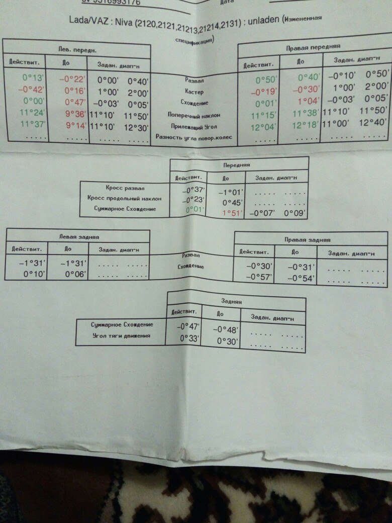 QUOTE(Skarb @ Mar 20 2017, 18:32) Доброго дня нивоводы.Очередная проблема с моей Нивкой 2131.Поехал на розвал,очередной раз\замена шаровых\,а мне спец по розвалу сказа что на такой машине нельзя ехать больше 60км.Причина в заднем мосту.Он оказывается согнут, как пропелер.Летом делал розвал все било в норме.Сальники не текут,редуктор не гудит\новый пробег 15т.\Как можно проверить геометрию моста или сразу по замену?Реактивные тяги менял в конце ноября 16 года. Доброго ,геометрия проверяется только на стенде КДС!!!! если есть распечатка выложите сюда и обсудим параметры, другого варианта не предусмотрено с ув. -------------------- Спасибо тем, кто меня ненавидит - вы делаете меня сильнее.