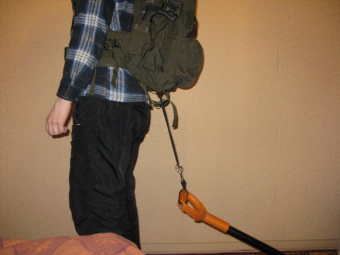 Уморило немного ваше творчество... Я рисовать не буду, добавлю буквами. Поводок для собак все видели? Есть и петелка и карабинчик. У нас один товарищ прибил гвоздиками к деревянному черенку и ходит с лопатой на поводке. К фискарю можно приклеить изолентой. Если прилепить в двух местах (у ручки и у черенка), будет вам лопата за спиной.