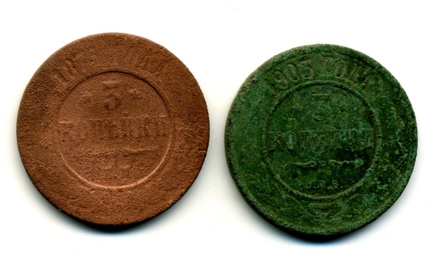 А другой трояк в таком зелёном виде лежит уже три года и хоть бы что. Только что делать, если монета ценная. При чистке в подобном состоянии, чёткий реельеф изображения сохранить практически не получается, потому что это уже окисел. |