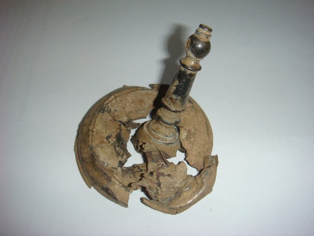 Приветствую! На фото фрагменты от какой-то крышечки (возможно) из серебра. Размер окружности 5 см. Ручка 6 см. Ручка оторвана от основания, само основание разорвано на несколько частей.