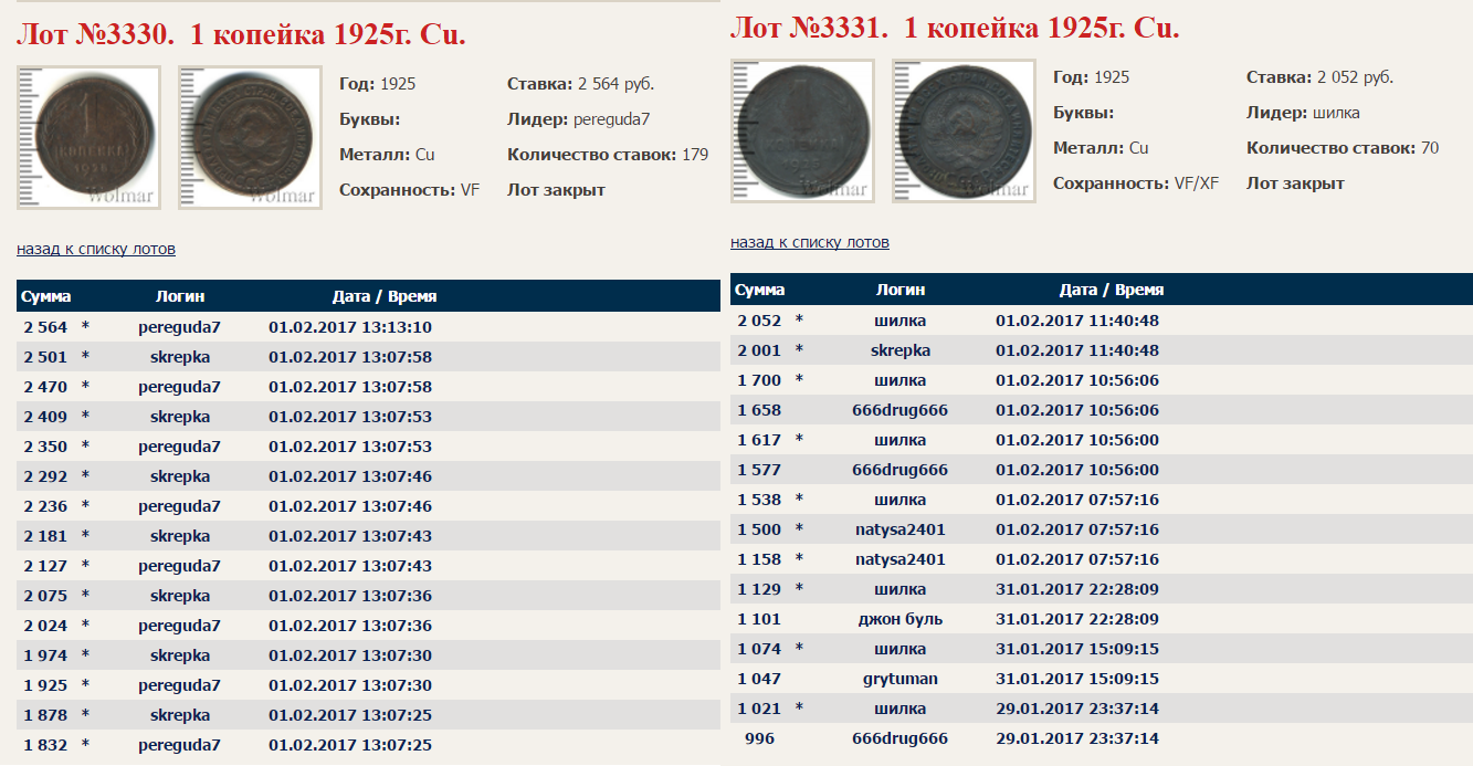 QUOTE(Урман @ Dec 20 2016, 13:54) А как же поглядеть, эту самую пользу. Внимание господа, да простят меня великие и ужасные модераторы, но я все таки размещу ниже фото с продаж копеечки обсуждавшейся здесь: http://www.reviewdetector.ru/index.php?sho...c=55622&st=1860 Ниже фото с сайта по её(копейке 1925) продаже(лот№3330). Обратите внимание что рядом продавалась еще одна коп. 1925 (лот №3331)в более лучшем сохране чем моя, но этот сохран - "альтернативный" в оксиде. Результат по цене и следовательно оценке сохранности на лицо. Не буду утверждать, но по продаже похоже на самовыкуп хозяином. Покупка моей копейки: http://www.reviewdetector.ru/index.php?showtopic=1518559&hl= Еще раз прошу не отправлять меня сразу в баню, если я что-то сильно нарушил. Данный пост размещен не с целью рекламы посторонних ресурсов, а в подтверждение оценки сделанных мною теоретических и практических выводов. Сообщение отредактировано мисюра: Feb 8 2017, 15:00 Вложенные эскизы изображений -------------------- Преобразование/разложение солей и оксидов на монетах в металл. Патина без химии.