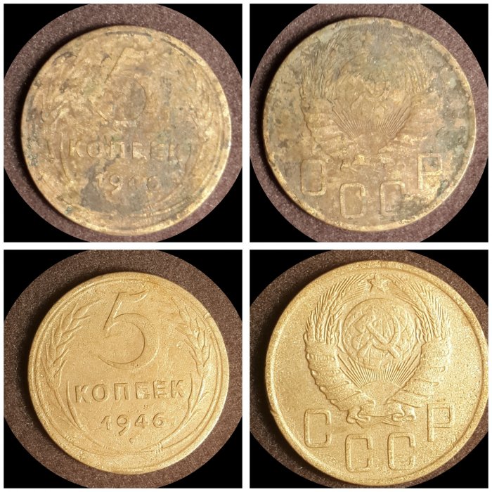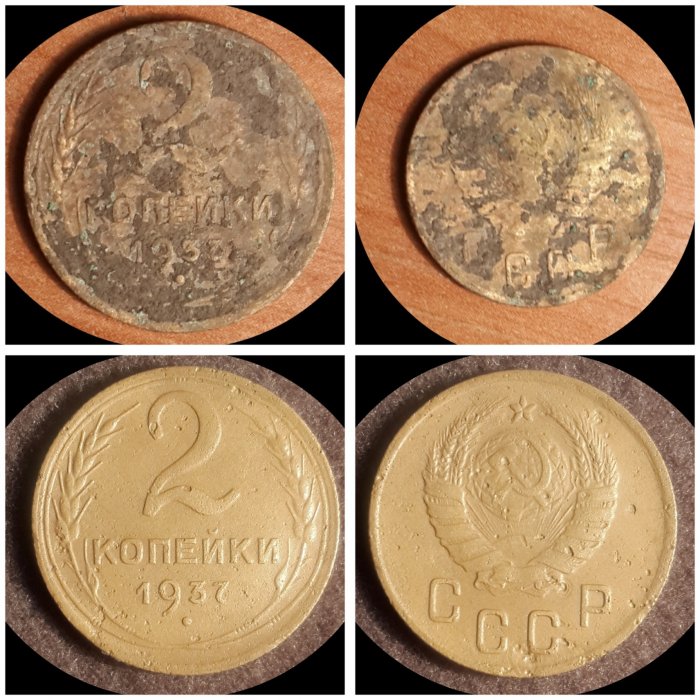 А как просто почистить 10-20-копеечные монеты 1950-х годов на фото? ПРошу подсказать. Из реки.