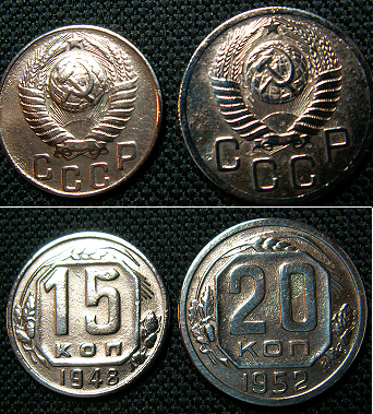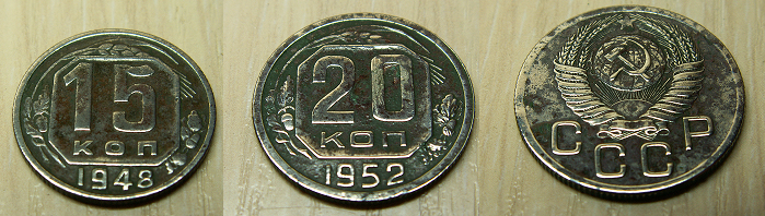 Хочу показать результат чистки пастой ГОИ монет СССР из медно-никелевого сплава. 20-ти копеечник изначально был покрыт плотной зелёной бахромой.Рельеф практически не читался. Вид 15-ти копеек был чуть-чуть лучше. Фото сделано после прохождения монет через мыльный раствор.