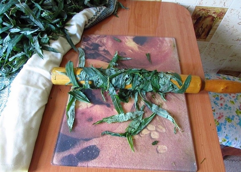 Время идет, лист становится все больше и грубее, черешок листа уже не разрушается в руках, при формировании «колбасок», и в конечном это должно сказаться на качестве чая. Чтоб раздавить его делаю так… на рифлёной, стеклянной доске прокатываю листья скалкой. Сто процентов конечно не разрушишь, но в основном все ОК. Лист при этом становится совсем вялым и хорошо скатывается в колбаски. Недостаток этой операции в увеличение времени, на подготовку к ферментации. Само собой она не нужна, если пропускаешь через мясорубку.