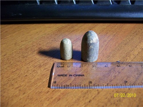 http://s009.radikal.ru/i310/1012/ba/f4f000b03c62.jpg 1. Первый ряд: первая пуля - минье, три следующих - разновидности пуль типа притчетт, последнюю американцы называют "пуля с плоским дном" (больше найти по ней мне ничего не удалось). 2. Второй ряд: первая пуля - притчетт к винтовке энфилда (такие же использовались в Крымскую войну), следующие две я не идентифицировал, предпоследняя - уильямс, ну и сферическая к гладкоствольному ружью. 3. Третий ряд: первые две - револьвер кольт, третья - револьвер сэвэдж. Выкопаны в Петербурге, штат Вирджиния, где были крупные сражения. Многие модели штуцеров, использовавшихся в Крымскую войну попали в штаты, в связи с чем можно найти одинаковые пули. Вот, например, пуля притчетт от винтовки энфилд с Севастополя и с Петербурга (Вирджиния). Может показаться, что есть отличия, но это из-за деформации одной их них при выстреле - в действительности пули абсолютно идентичны. http://i041.radikal.ru/1012/0e/fcf0a01ba3fe.jpg http://s45.radikal.ru/i110/1012/06/b1fb8565a1bb.jpg |