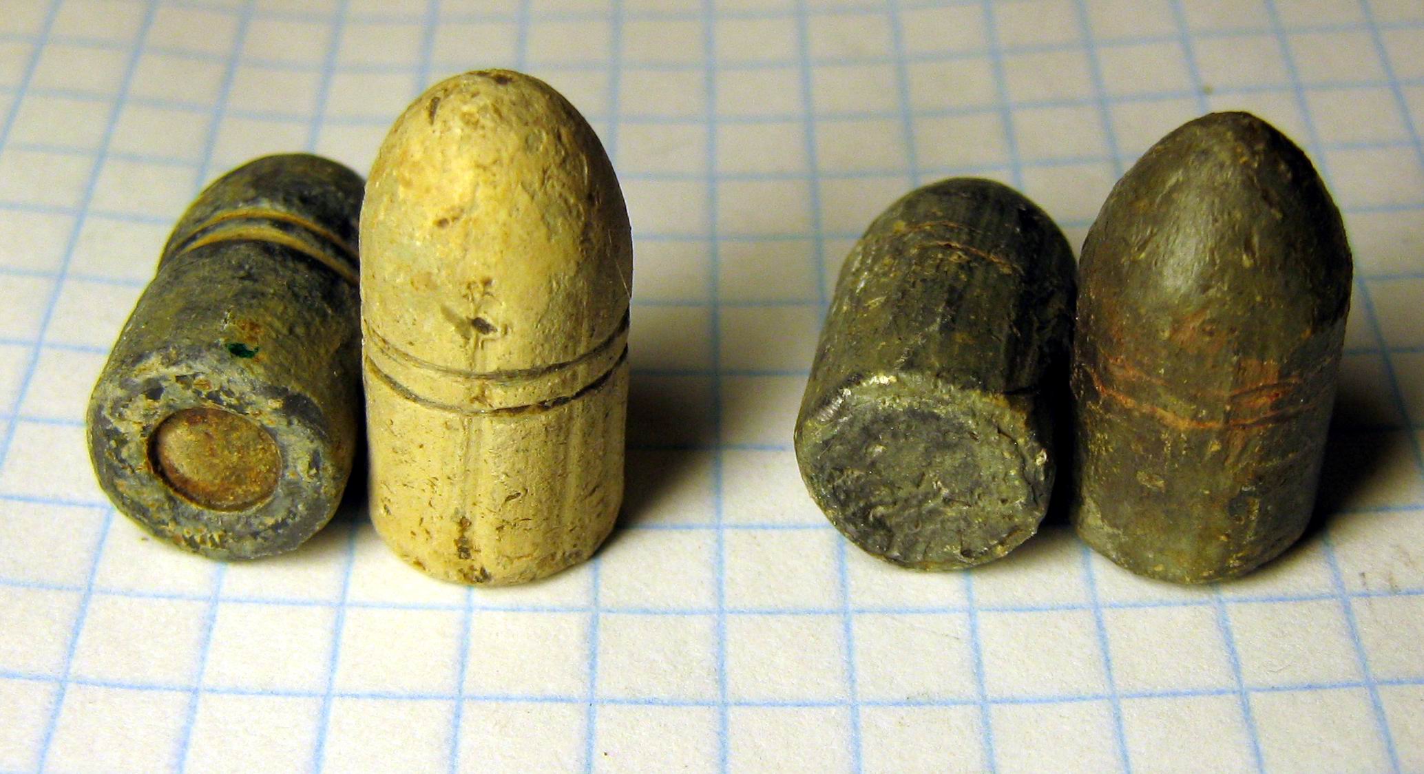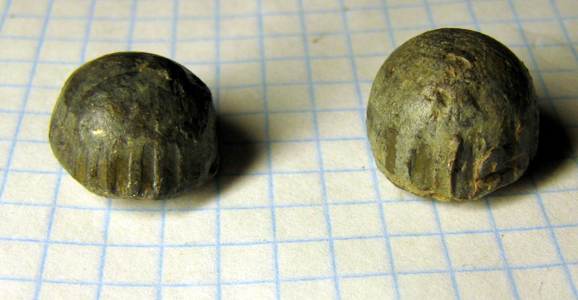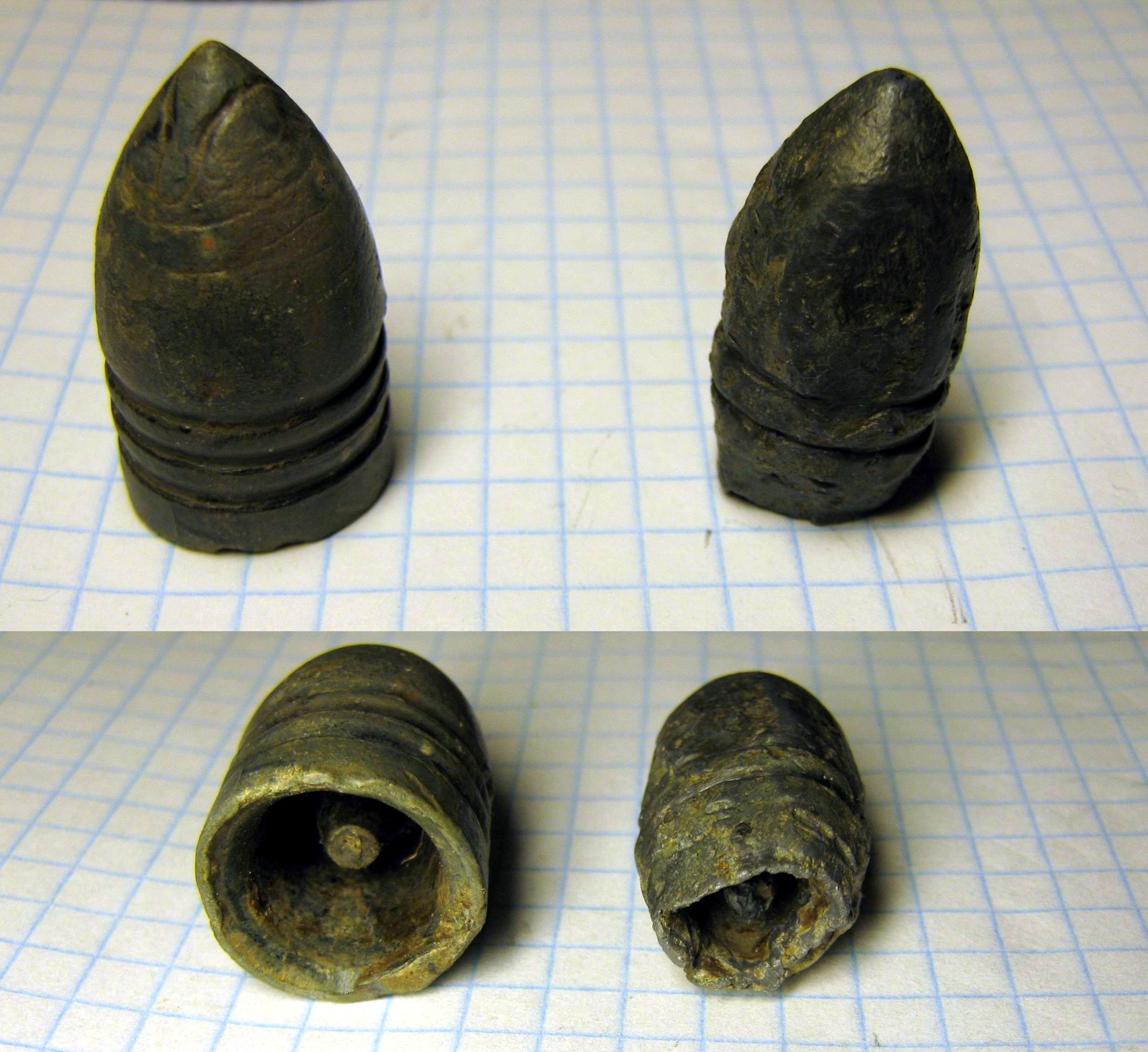 К сожалению первые фото были без масштаба и определить размер непросто Похожа на пулю Минье и иже с ними Как правило имеет три каннелюры, после выстрела значительно деформируется (расширяется) вплоть до утраты оных Пули клеймятся совершенно иначе. На фото вижу поперечные царапины наложившиеся на остатки канелюр |