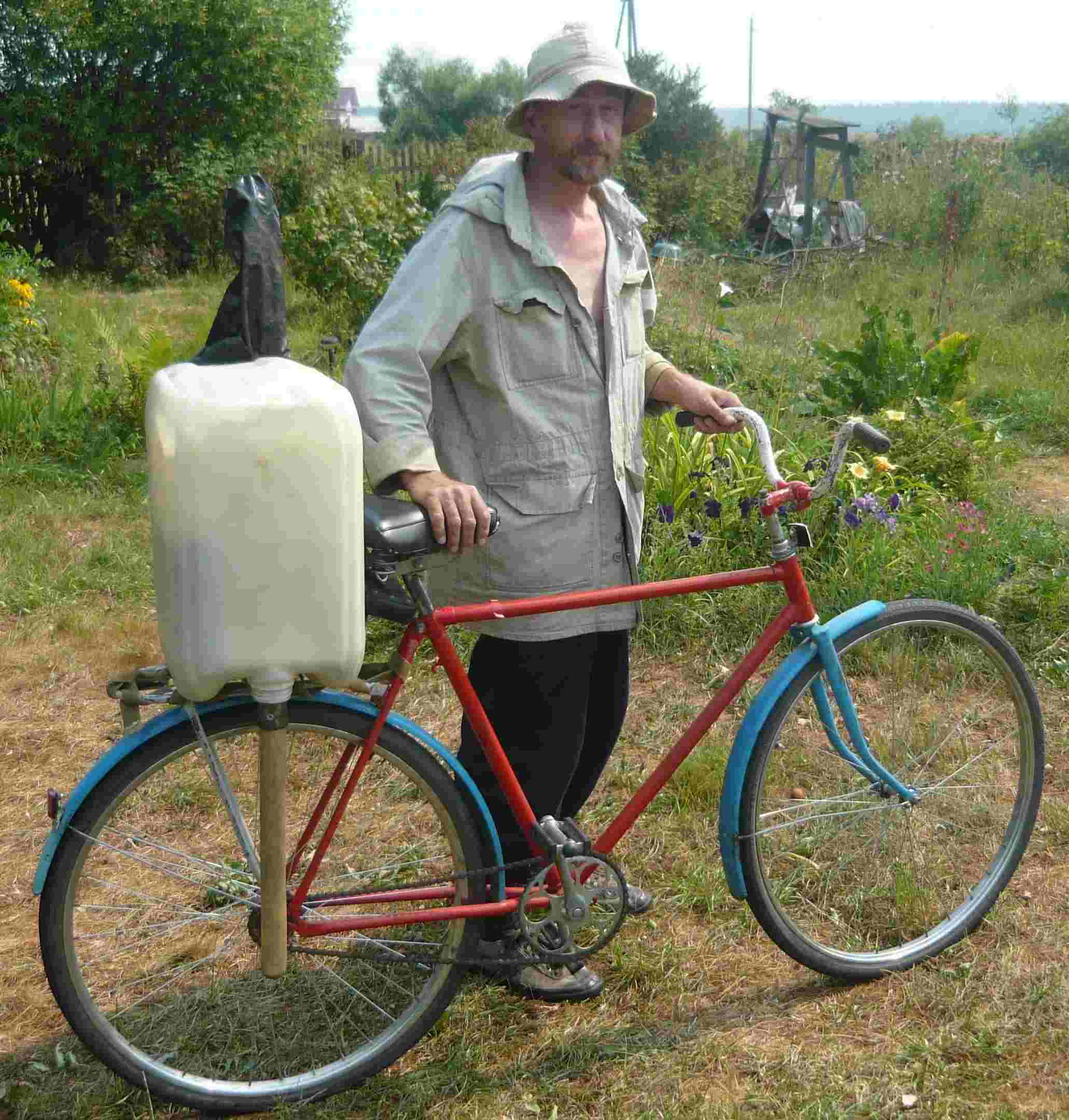 Давно использую для поездок по окрестностям советский дорожный велосипед: простой, прочный, достаточно лёгкий для перетаскивания через завалы в лесу. Оставляю на открытом месте, где обычно никто не ходит, например, в поле под кустом. Да и не особенно жалко. Для перевозки грузов приспособил 30 л канистру. За ручку привязана к багажнику, в горлышко вставляется ручка лопаты, внутри на вспененный материал укладывается разобранный прибор и вся остальная амуниция. Дно канистры прорезано с трёх сторон и образует отгибающуюся крышку.