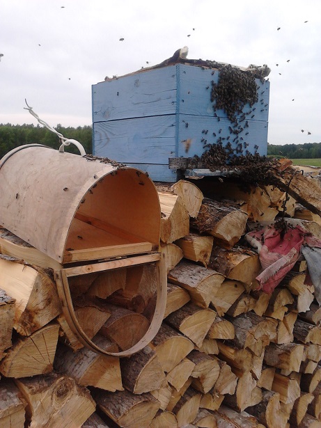 Вылетел сегодня рой и так неудачно привился, на поленницу........