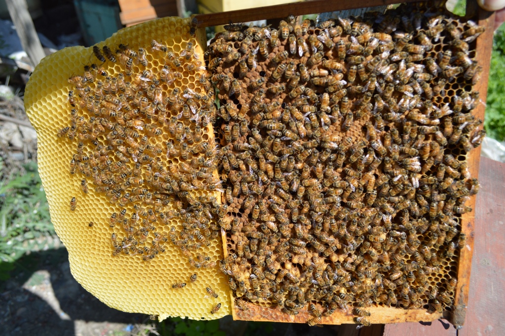 Вчера при осмотре обнаружил семью без матки и расплода. Пришлось их объединять с самой слабой семьей, но имеющей сеющую матку. Через пару дней посмотрю что получилось. Объединял вечером с помощью виноградной 40 градусной чачи. Бойни не было, но беспокоюсь за матку.