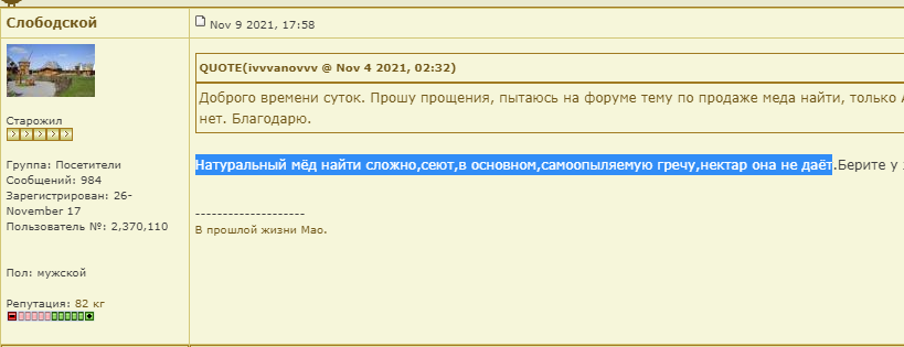 QUOTE(ivvvanovvv @ Nov 4 2021, 02:32) Доброго времени суток. Прошу прощения, пытаюсь на форуме тему по продаже меда найти, только Al, но нет ответа. Скиньте ссылку пожалуйста, приобрести для себя гречневого хочется, в наших краях нет. Благодарю. Натуральный мёд найти сложно,сеют,в основном,самоопыляемую гречу,нектар она не даёт.Берите у знакомых,хоть какая-то гарантия. -------------------- В прошлой жизни Мао.