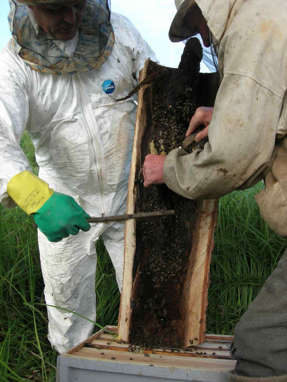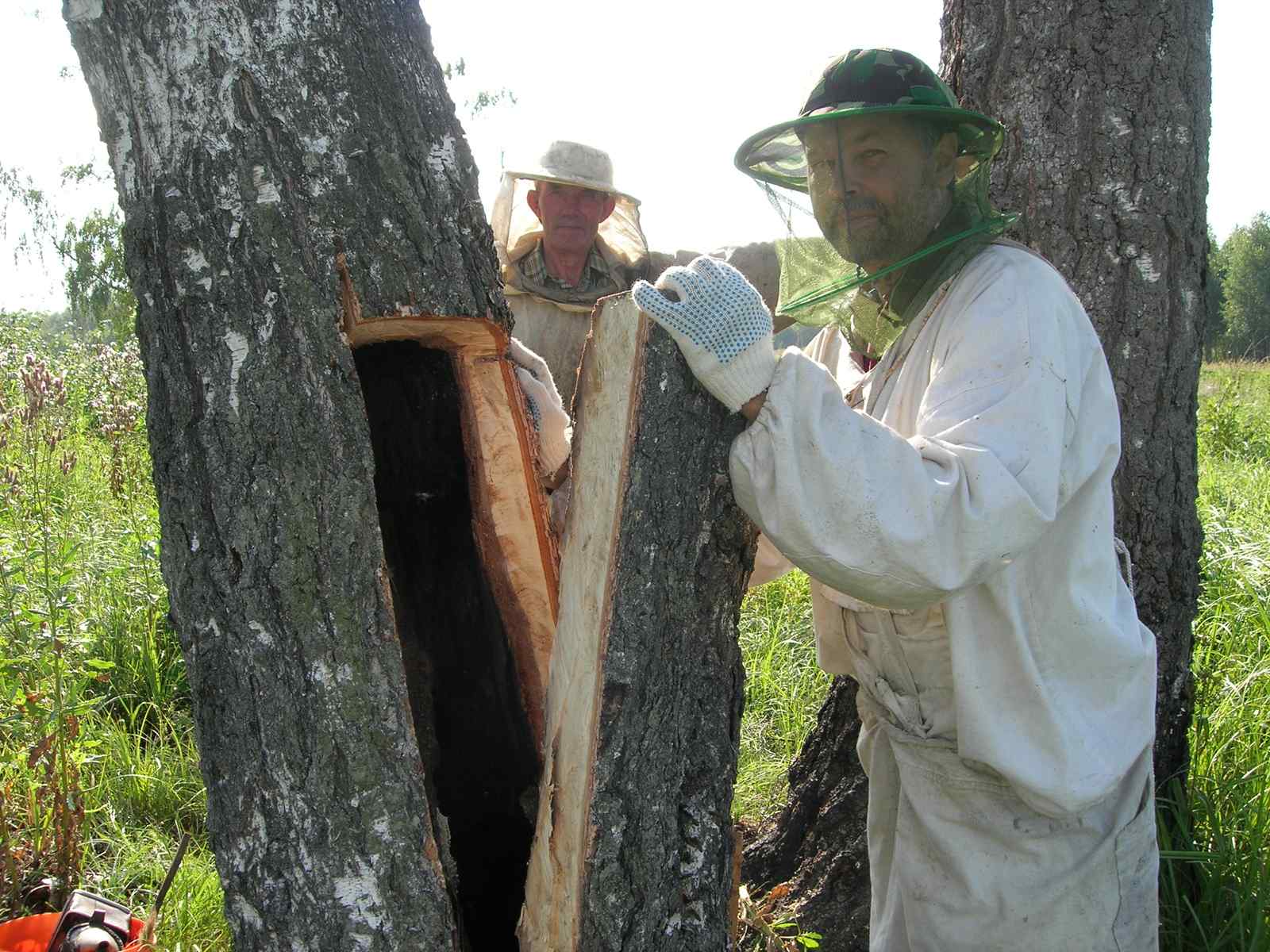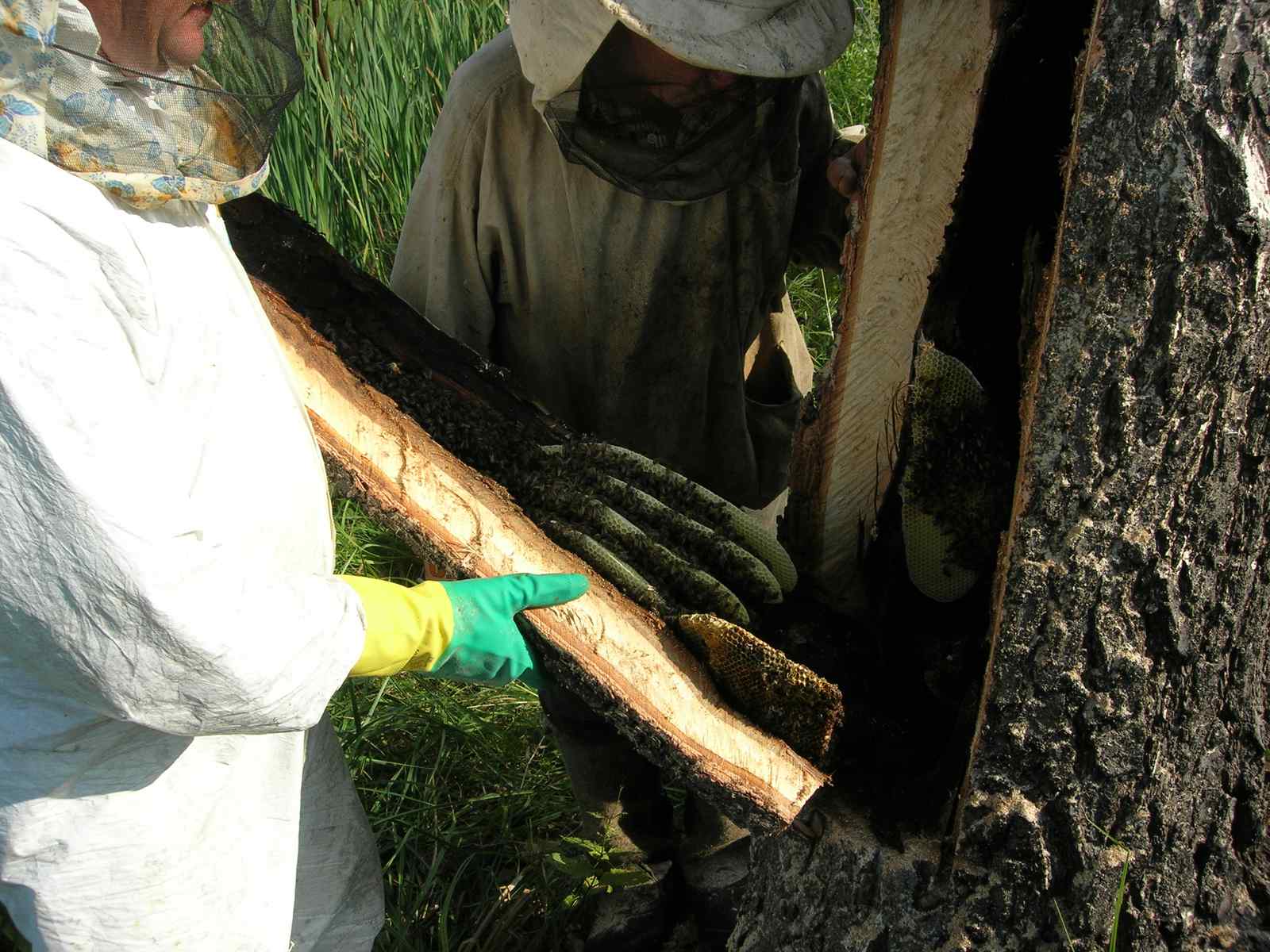 Вскрывать выпиленную переднюю часть дупла всегда приходится очень осторожно. Чаще к ней и стенке напротив прикрепляются соты, которые могут разрушиться и всех перемазать медом, а это не есть хорошо.