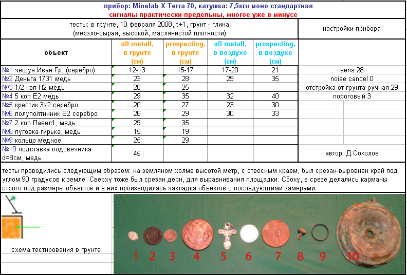 QUOTE(DeSo @ Feb 12 2008, 14:03) Немножко потеплело, и мне удалось тоже сделать тест в грунте Х-терры70 со стандартной моно катушкой. Сделать такой тест хотелось давно, в первую очередь лично для себя, дабы лучше понять прибор. Решил добавить их сюда. Методику теста описал в таблице, постарался сделать ее информационно-автономной) Дабы было понятно, что и как. Плюс в ней есть для некоторых объектов и показатели по воздуху. Разбег по чешуе в воздушных показателях обусловлен тем, что на разные чешуйки расстояние немного меняется. Приобрету ДД-катушку сделаю тест и с ДД катушкой. Занятие нескучное) Делал с подругой, два часа точно. Весь в глине перевозился под ногами подтаявший снег и размазанная глина))) Очень мне хочется увидеть такой же тест на Whites MXT и DFX и Гаррет 2500, если владельцы данных аппаратов занялись бы - было бы интересно. P.S кстати мои результаты, как и ожидал, совпали с результатами уважаемой команды тестеров по данному прибору с данной катушкой. Спасибо!Всё грамотно оформил! -------------------- А ты что,рассчитывал здесь увидеть живого епископа?!