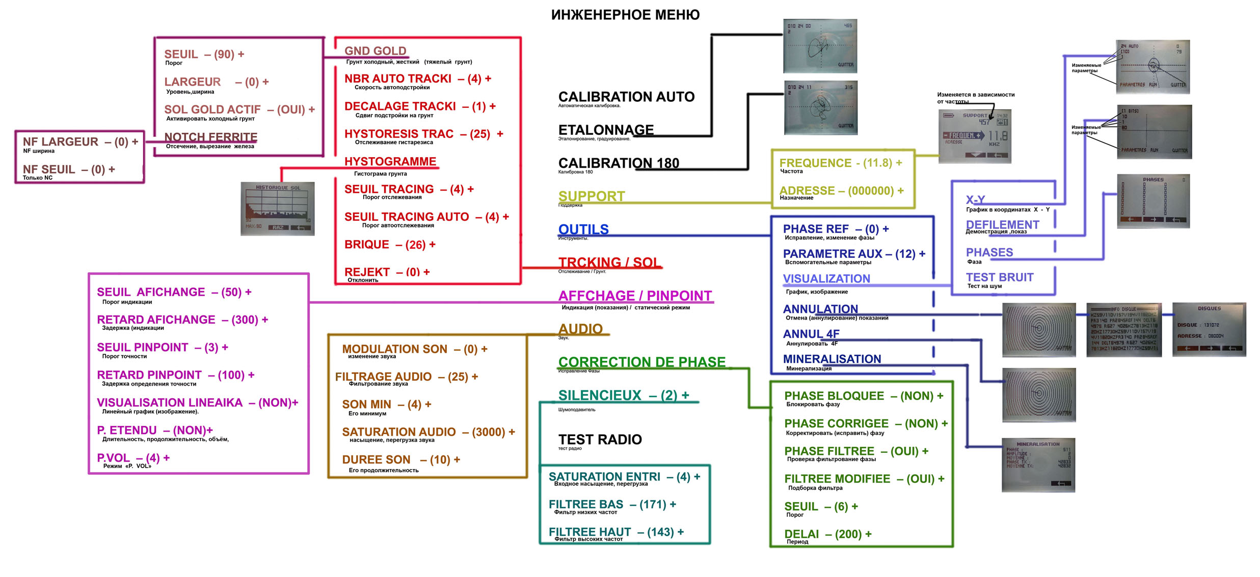 QUOTE(uspeshnik @ Jan 5 2011, 01:51) Судя по всему, многие не имеют перевода ИМ. Выкладываю перевод ИМ 1.2 FR. Кое что помню со школы, кое что переводил со словарём (книга). 1. Etalonnage - Эталонирование, градуирование. 2. Calibration 180 - Калибровка 180. 3. Outils - Инструменты. 3.1 Phase ref - Исправление, (изменение) фазы. 3.2 Parametre aux - Вспомогательные параметры. 3.3 Menu visualization - Меню визуализации. 3.3.1 Defilement – Демонстрация, показ. 3.3.2 X-Y - Показ в системе координат X-Y. 3.4 Test annulations - Отмена (аннулирование) показаний. 3.5.1 Annul 4f - Отменить (аннулировать) 4f. 4. Tracking / Sol - Отслеживание / Грунт. 4.1 Notch Ferrite - Отсечение (вырезание) Железа. 4.2 Nbr auto tracking - Автоотслеживание NBR. 4.3 Decalage tracking - Интервал, смещение, сдвиг отслеживания. 4.4 Hysteresis tracking - Отслеживание гистерезиса. 4.5 Histogramme - Гистограмма. 4.6 Seuil tracking -Порог, (начало) отслеживания. 4.7 Seuil tracking auto - Порог, (начало) автоотслеживания. 4.8 Inhibition - Торможение, подавление. 4.9 Reject - Отклонить. 5. Affichage / Pinpoint - Индикация (показания)/ Точность. 5.1 Seuil affichage - Порог индикации (показаний). 5.2 Retard affichage - Задержка (опоздание) индикации (показаний). 5.3 Seul pinpoint - Порог точности. 5.4 Retard pinpoint - Задержка (опоздание) точности. 5.5 Visualisation lineaire - Линейный график (изображение). 6. Audio – Звук. 6.1 Modulation son - Его изменение (модуляция). 6.2 Filtrage audio - Фильтрование звука. 6.3 Son min - Его минимум. 6.4 Son max - Его максимум. 6.5 Duree son - Его продолжительность, время звучания. 7. Correction de phase - Коррекция фазы. 7.1 Phase bloquee - Блокировать фазу. 7.2 Phase corrigee – Корректировать (исправить) фазу. 7.3 Phase filtree - Проверка фильтрование фазы. 7.4 Filtre modifiee - Включить регулируемый фильтр? 7.5 Seuil – Порог. 7.6 Delai – Период. 8. Silencieux – Шумоподавитель. 8.1 Saturation entrée - Входное насыщение, перегрузка. 8.2 Filtre bas - Фильтр низких частот. 8.3 Filtre haut - Фильтр высоких частот. 9. Test radio - Проверка радиоканала. 9.1 Test relais - Проверка реле. 9.2 Porteuse - Несущая. 9.3 Detection – Детектирование. 9.4 Porteuse disque - Несущая катушки. 10. Notch ferrite - Вырезание железа 10.1 Notch F. bas - Вырезание железа на низких частотах. 10.2 Notch F Haut - Вырезание железа на высоких частотах. 10.3 Valid – Применить. 11. Usine permanent – (Применить?) заводские установки. Oui –да. Non – нет. -------------------- Ничего не покупаю и не продаю. Только консультации.