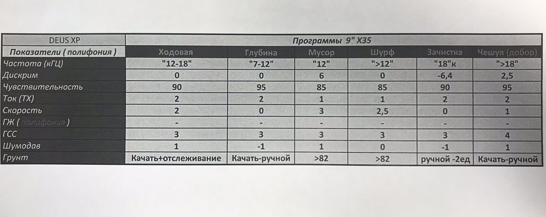QUOTE(Алексей Ш. @ May 28 2019, 17:00) Составил для себя несколько программ,чтобы забить их в прибор. Считаю, что помимо стандартных, имеют место быть и свои. Что скажите? Полифония. 9 дюймов. Х35. Не много исправил программки, проверив опытным путем. Ув. профи прибора #XP DEUS поделитесь конструктивными правками или что упустил? Спасибо. Понимаю, что есть и стандартные программы для любого вида поиска и на каждом месте всегда нужно что-то менять в настройках. Но всегда приятно иметь что-то свое в арсенале, такое эдакое. Сообщение отредактировано Алексей Ш.: Aug 9 2019, 12:32 Вложенные эскизы изображений -------------------- Денег на хлеб нет, поэтому икру накладываем на колбасу...