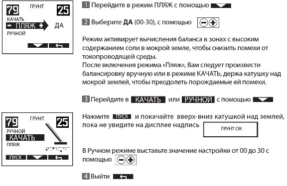 Подскажете пожалуйста, как работать с настройкой грунта, мокрый пляж. С обычной ручной настройкой грунта всё проще,там цифры есть с реальным грунтом. Знаешь на сколько единиц отстраиваться. А тут только 0 и 30 и не каких показаний. Подскажите люди.