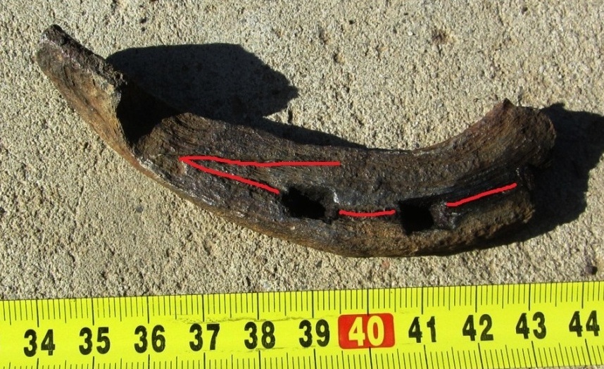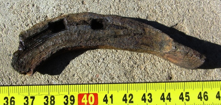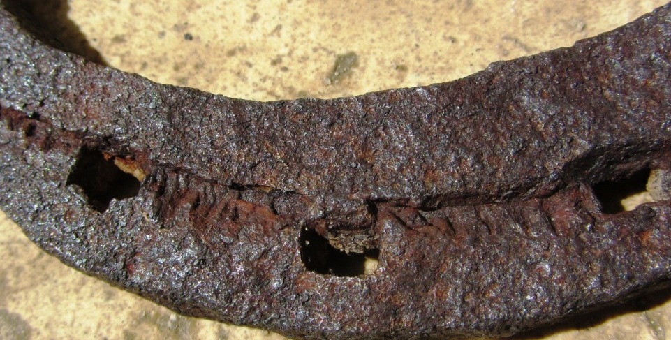Нашли на Цимлянском водохранилище половинку подковы, точно такую уже здесь определял, вопрос на подкове, вместе с канавкой под ухнали выбит угол на обоих подковах, для чего это? Возможно один автор делал?