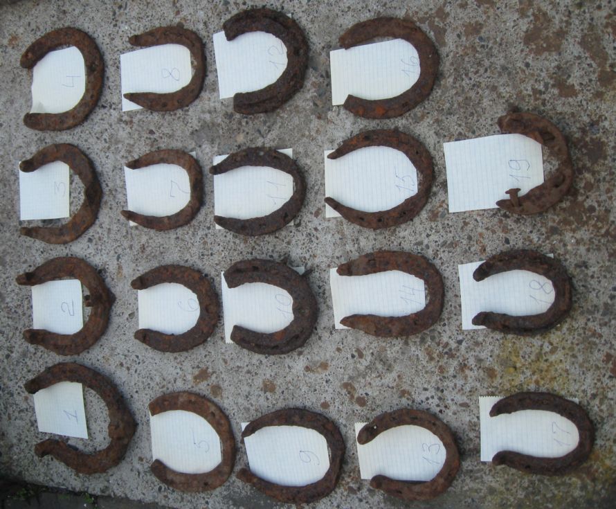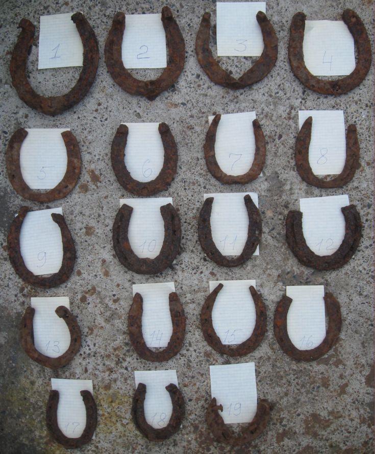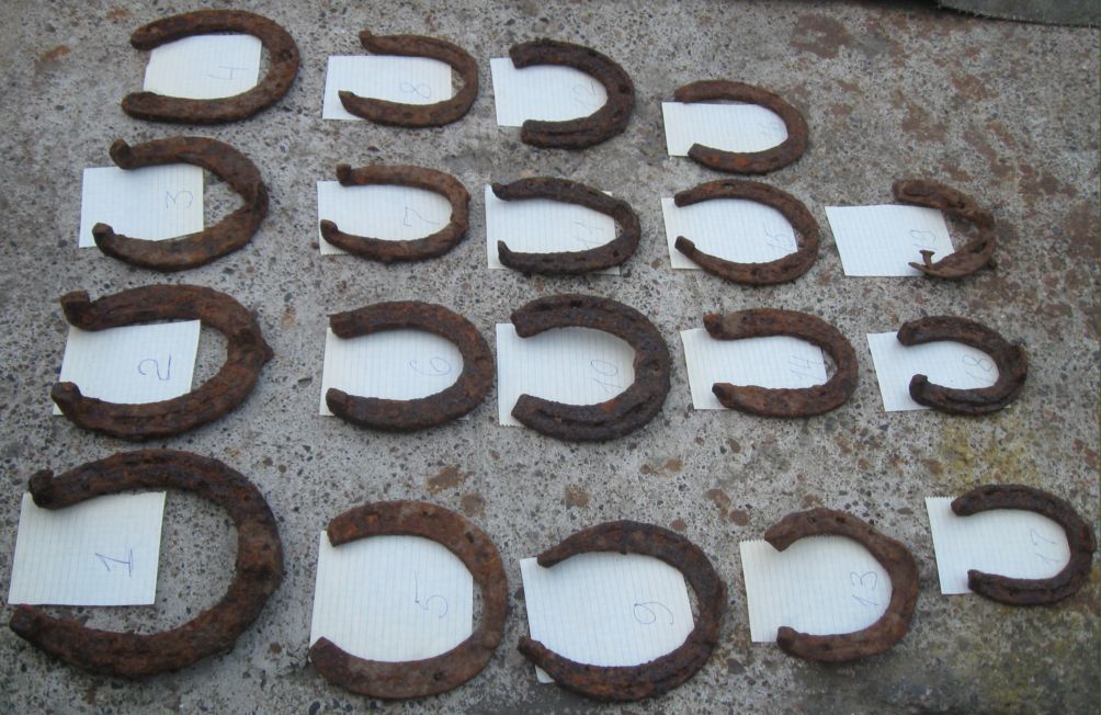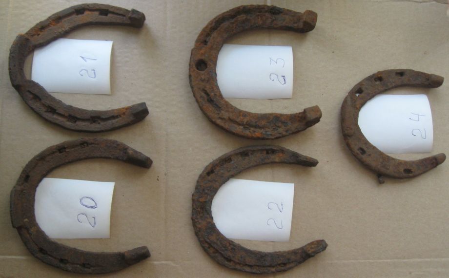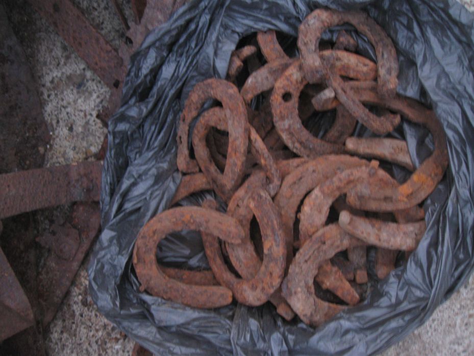 Такие мешки подков - это, как правило, либо от кузницы осталось добро, либо от воинской части, когда ещё лошади активно использовались. Большинство подков - это 20 век уже. Непонятно только, как туда пара "восемнашек" попала и, тем более, средневековая "одношипка".