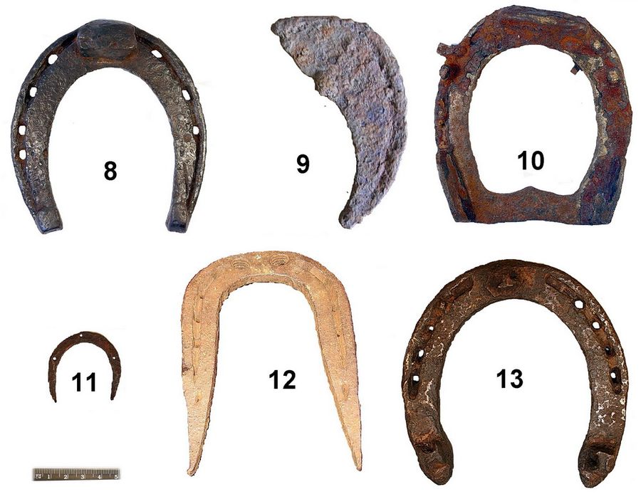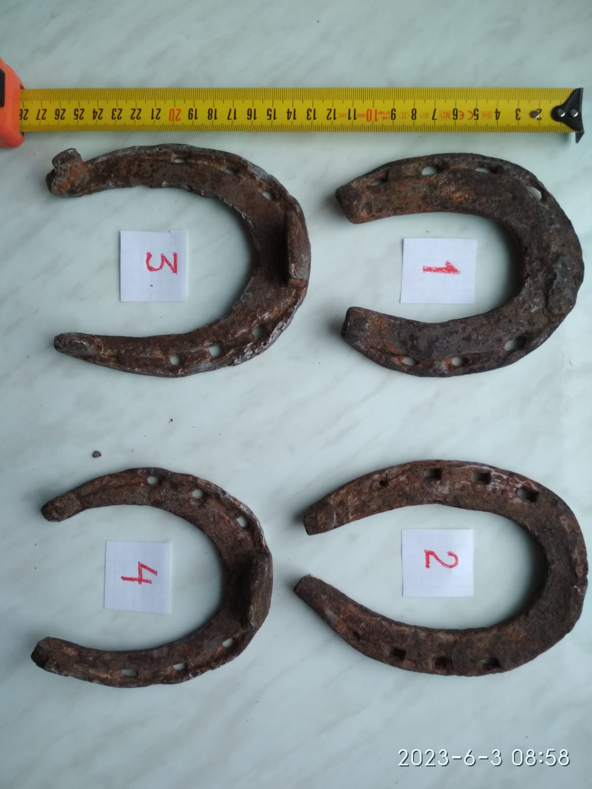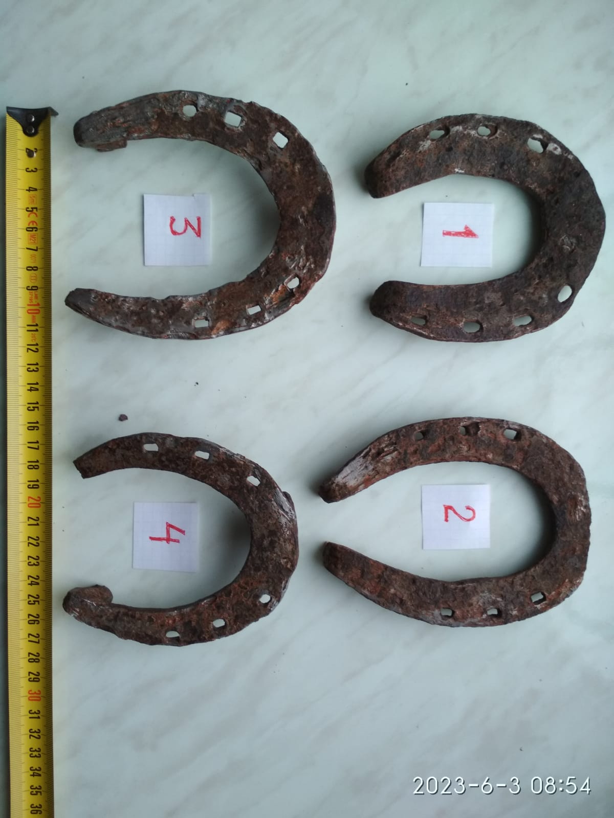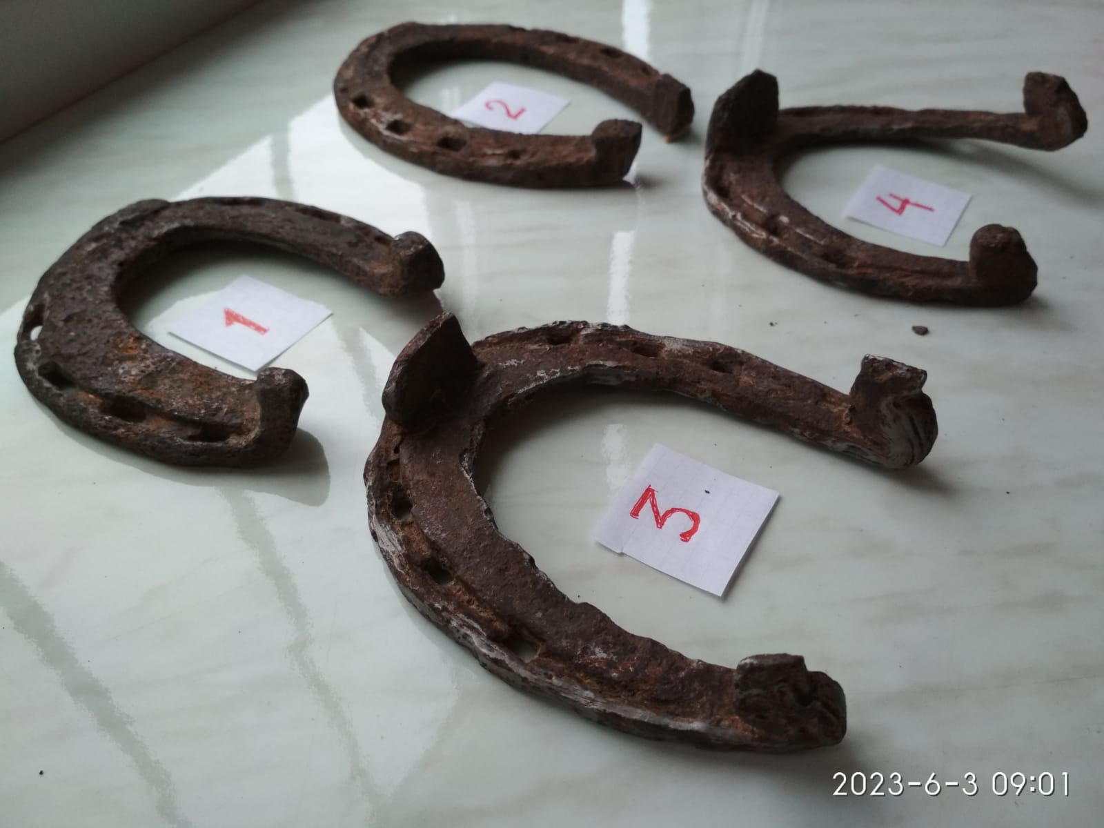 Набралось немного подков. Изучил форум, тема интересная. Решил заняться реставрацией. Выбрал ряд подков. Хотелось бы узнать их датировку И возник ряд вопросов: - №2 - отсутствие гвоздевой дорожки - №3, №4 - по 3 гвоздевых отверстия с каждой стороны, хотя у обычно по 4 И вообще, что можно сказать об этих подковах? Все подковы найдены в лесу на западе Подмосковья |