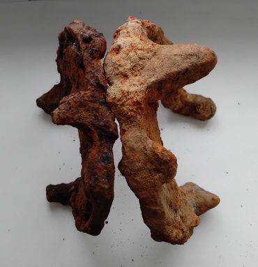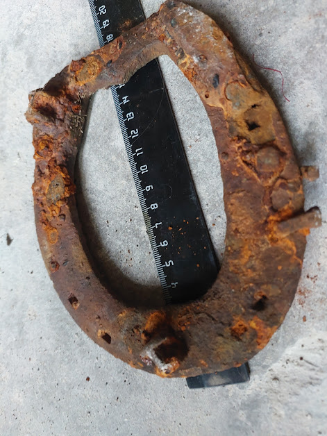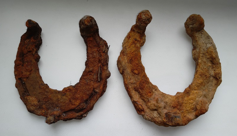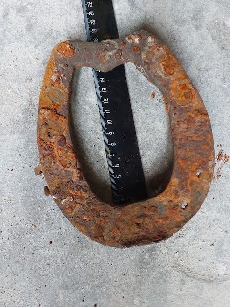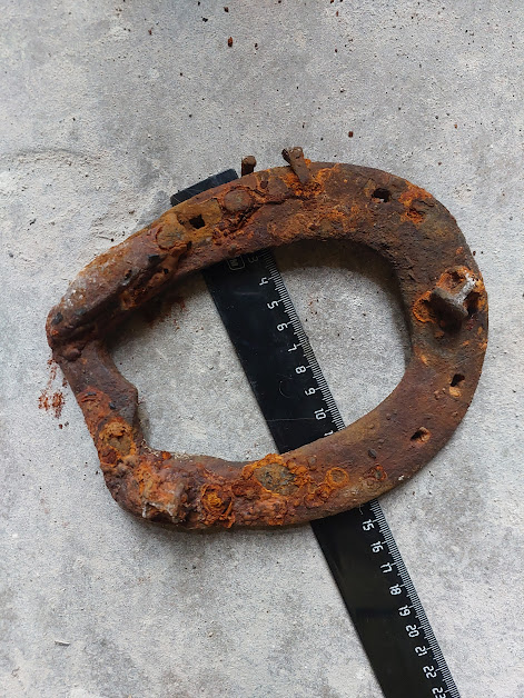 Попалось ещё две подковы упомянутого прежде типа, левая вполне обычных для 16-17 в параметров, а вот правая значительно массивнее, местами чуть не в два раза толще, чем более схожа с подковами 18-19в. Интересно это просто действительно более поздняя подкова или же просто более массивное исполнения того же периода 16-17в .