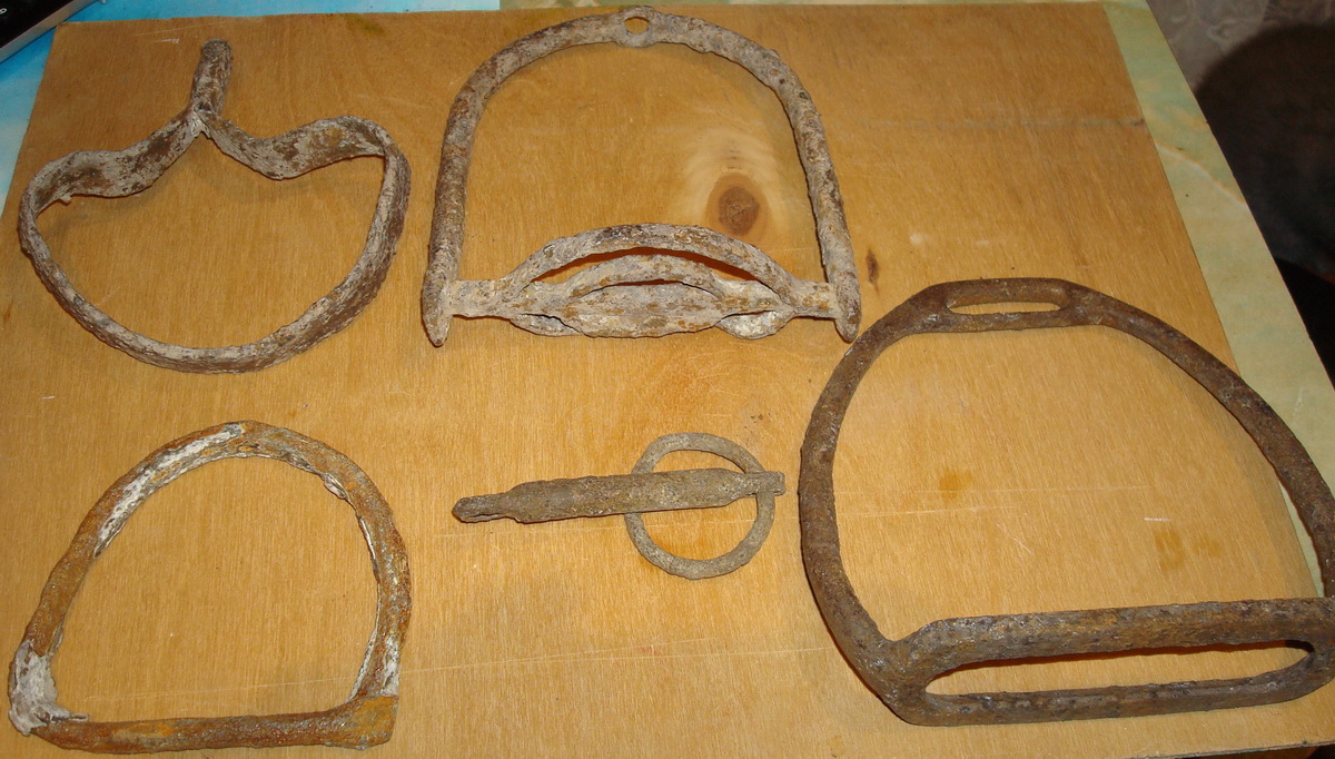 По стременам я не спец, однако то, что справа - ИМХО 20в, использовалось и во время Великой отечественной (находил на позициях), удила, думаю, кон 19- 1 пол 20в, стремя в середине, возможно, 17-18в, те, что справа, более ранние, но, повторюсь, в стременах я не профи.