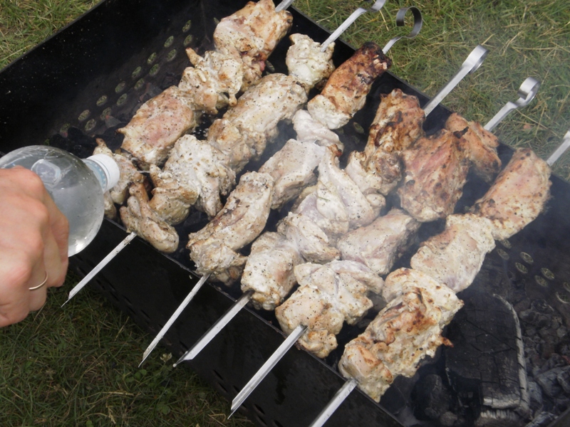 Корешь, угли сильнее надо раздуть и равномерно уложить, а то с краев запекается, а по центру шампура мясо не жарится.