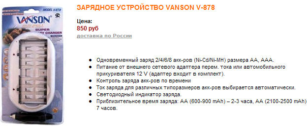Vanson V6988 слишком слабенькое, большое время заряда - для АА 1800 ма - 12 часов, нет зарядки от прикуривателя в машине.
