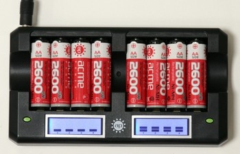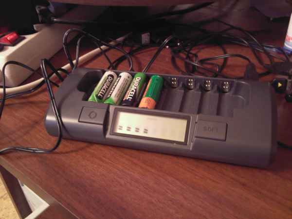 Одно неудобство: зарядных устройств пришлось взять две штуки (каждое в комплекте с 4 Ni-MH аккумуляторами размера АА/R6 емкостью 2850мАч), а устройство на 8 аккумов не попадалось мне в продаже ни разу. |