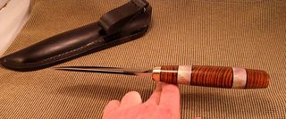 Брал только по ТХХ и внешнему виду, очень боялся что не ляжет в руку, но когда получил, был очень доволен......причем в левой руке лежит даже лучше чем в правой. http://talks.guns.ru/forums/icons/forum_pi...565/4565916.jpg http://talks.guns.ru/forums/icons/forum_pi...565/4565924.jpg http://talks.guns.ru/forummessage/94/640622-88.html №77 Клинок Андрея Бирюкова сталь кованая 95Х18. Размеры 132 * 27 * 4 Твёрдость клинка HRC 57-59 Рукоятка 125 * 32 * 22 Бронза,зебрано,рог лося.Монтаж практически сквозной. Рукоятка в сечение-яйцо. Пропитка масло для полок, сил. щеллак. Ножны-кожа 3 мм, вкладыш-лиственница. Подвес свободный на кольце. Шинкует бумагу и волосы как комбайн. Вес ножа 174,6 гр. ножны 111,3 гр, Там же, но у другого мастера прикупил клин дамаскую мозаику, очень захотелось самому одеть, приобрел некоторые инструменты и запчасти, этой зимой начал делать потихоньку, но чет пока нет времени доделать. Обязательно покажу как доделаю. ЗЫ: Был на Клинке в Сокольниках в прошлов году, не очень понравилось, очень много барахла продают, а поехал только с кузнецом познакомиться! Всем спасибо. Вложенные эскизы изображений |
