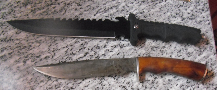 А у меня вот такой, сделал сам на скорую руку. Метал нож с рейсмуса, ручка из капа или как там сувели что ли. Уже лет 10 служит. лосей и кабанов попластал немало. Потемнел немного, лимоны резал. Верний просто для понтов, купил по случаю лежит дома.