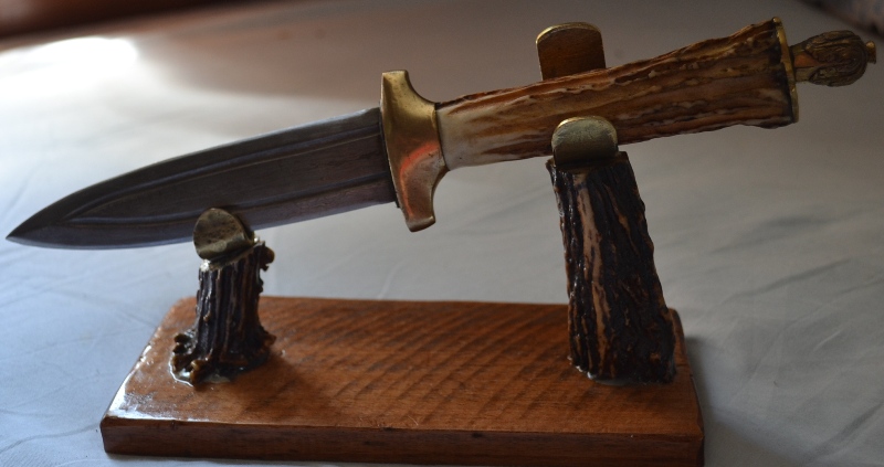 кинжал "Охотник на оленей" клинок дамасск (Бирюкова) толщина 3,8мм, ширина 40мм, длина 180мм рукоять рог косули гарда и навершие запчасти от чиновничьей шпаги возможно будет выставлен в продаже (не является ХО тк не заточен. острие скругленное не менее 3мм) Вложенные эскизы изображений -------------------- "Погибает лишь тот, кто смирился с поражением!" ©