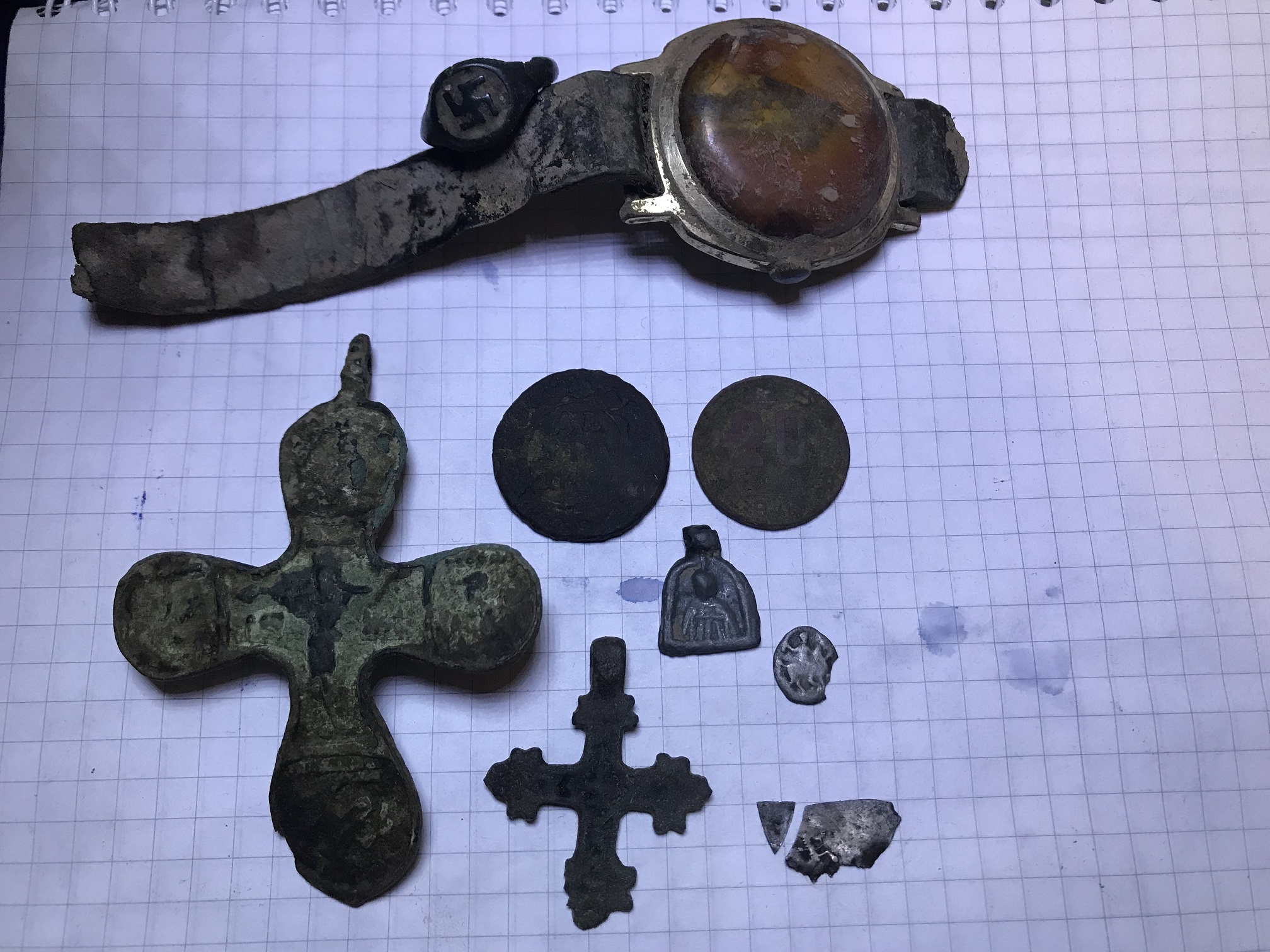 Вот что получилось найти в лесных дебрях Воколамска. Камрадам спасибо за компанию, было все удачно, хотя сохран металлопластики, изначально, казался лучше. Часы не моя находка, спасибо Сергеюsmile.gif!