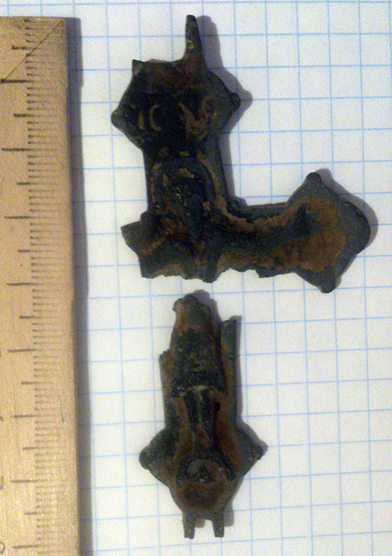 QUOTE(Mihail_ku @ May 11 2014, 10:26) Мне видится что это одна из...... частей крестика, петли выломанные, узоров и надписей не замечено. Для чего маленькие дырочки на лучах, я не в курсе, думал для ниток (сшивались половинки), но когда помыл, понял что нет. Рядом с местом находки все переискал, пусто. Надо было пригласить спеца по поиску....henfasa. |