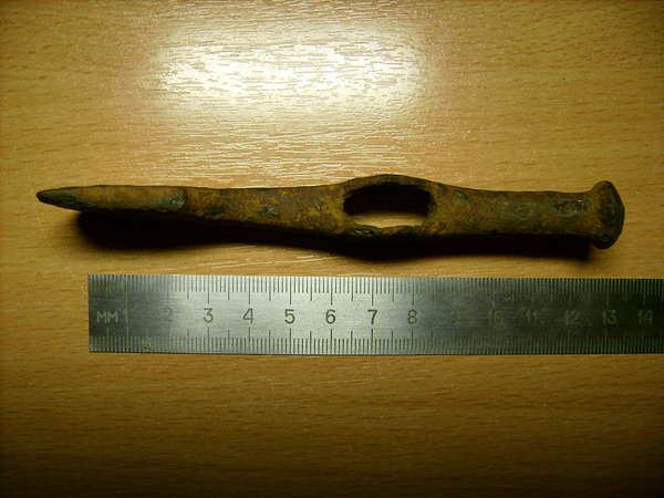 QUOTE(SergeiSAI @ Apr 21 2015, 11:28) У меня выдалось часика три-четыре свободных. Из Нахабино всё равно далеко за это время не уедешь. В полях не хотелось светиться, ну поехал в лес, около р. Истра. Похожу думаю, на свежем воздухе, погодка пока хорошая. А больше и некуда, за два года всё поля вокруг позастроили и окончательно всё замусорили. Приехал значит, берег песчаный высокий, крутой и обрывистый, лес вплотную подходит к берегу. Ну понятно по всему периметру берега, горы мусора, старого заросшего, и свеженького... ну всё как обычно. Отхожу в лес метров на сто, под листвой, сплошной "ковёр" пробок водочных, банок консервных и т.д. Ощущение, что последние лет сто и днём и ночью тут пило всё окрестное население. Короче ещё метров через сто пятьдесят вглубь, количество пробок и банок становится терпимым. Попался почерневший рубль ходячка. Потом мелочь пошла редкая, советы довоенные и военные, гильза от трехлинейки, два сигнала были "жирные" ну как всегда, пояски от снаряда. Сфоткался вот сам: ![]() Ходил в основном вдоль и около очень глубокого оврага в надежде на всякую старину. В принципе солнышко светит, птички поют, красота. Выскочило бы ещё что зачетное из земли - вообще хорошо) Копая очередной сигнал, похожий на железную консервную банку, вырыл небольшой топорик. В первую минуту подумал, что боевой, так как топорик совсем маленький и молоточек с обратной стороны ввёл в заблуждение: ![]() Когда расчислил само отверстие, ожидая увидеть круглую дырку, но форма отверстия дала понять, что к древности явно отношение топорик не имеет: ![]() Да и форма топорика конечно к древнерусским топорам никаким боком: ![]() Но явно не для рубки деревьев предназначен, кто его, и зачем тут таскал и потерял? Вообще-то у меня мечта найти классический древнерусский боевой топор. Потом сморю что-то впереди среди деревьев белеет. Явно не остатки снега. Пригляделся, что-то живое, двигается. Ну особо боятся не чего... Не с пустыми руками в лес пришёл, на поясе в кобуре травмат с восьмью патронами, рядом в чехле нож кизлярский, Таран называется. Да и Фискарь не последний аргумент в руках) Присмотрелся, какая-то девушка с собакой и фотиком по тропинке ходит, птичек по ходу фоткает. Меня увидела и в оцепенение впала.... ну я за деревьями, кустами, да ещё в этой косынке, вид ещё тот. Ну короче как-то так провёл свободные три часа на копе) Не у всех чеканов дырки круглые были....у европы много овалов например...а размерчик самое оно (таким дровишек не нарубишь Правда форма да...не очень , но кто его знает. Вложенные эскизы изображений -------------------- Профитроли и ПроффиТролли не одно и тоже