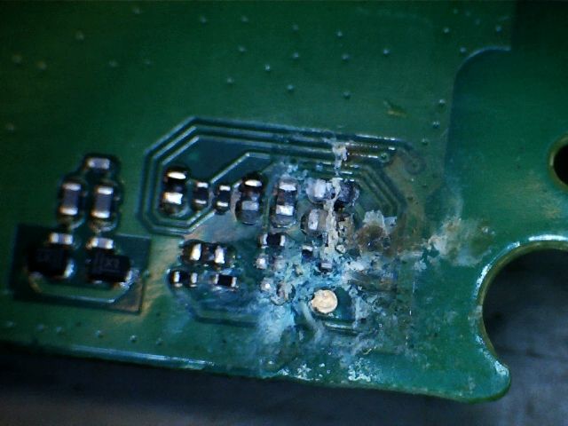 При подозрении попадания жидкости в блок управления XLT, нужно осмотреть места пайки разъема которым соединяется индикатор с платой блока управления. В процессе эксплуатации в местах пайки лак трескается, и при попадании влаги в блок управления образуется ЭХК. Визуально она выглядеть может по разному. Может быть в виде белесого налета, зелени, грязных пятен и пр. К сожалению свой блок я не фотографировал. Но, покажу на другой плате. Вообще мне часто приходится такие фотографировать, при отказе в гарантийном обслуживании.