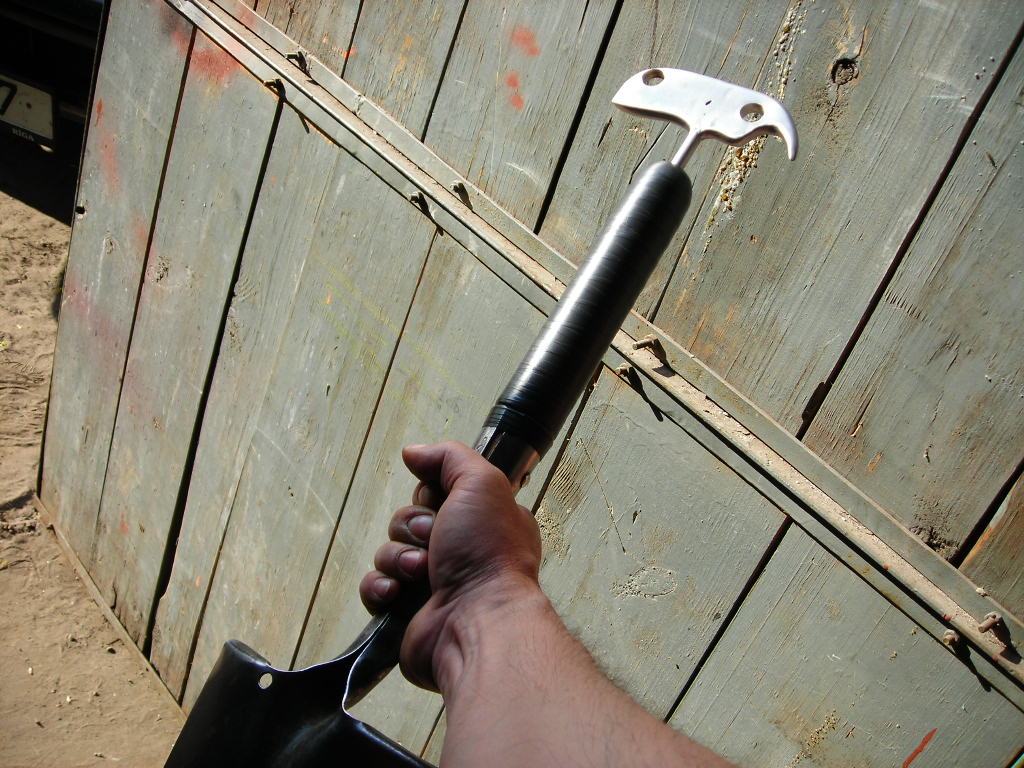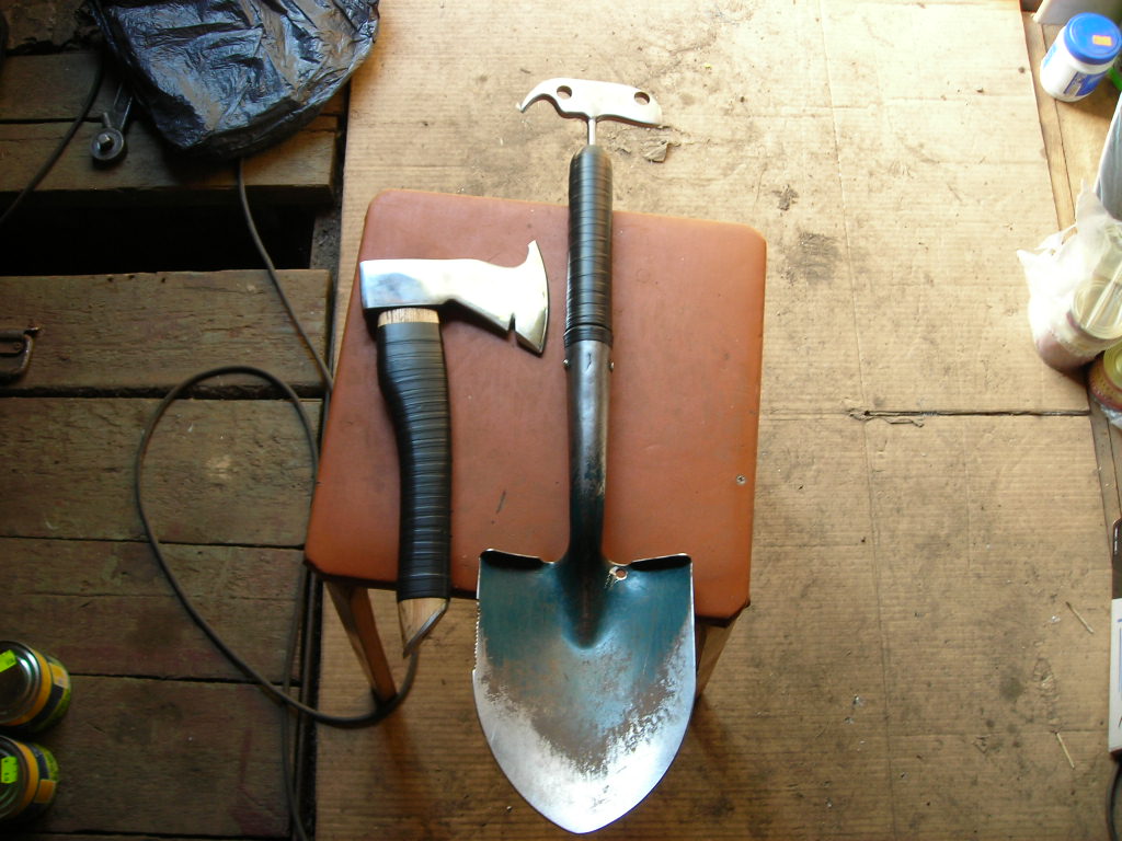 Немного усовершенствовал свой набор. Лопата стала многофункциональнее и гораздо удобней , а топор более грозным ... и" летным "(имею слабость к метаннию и стреляннию ...чо уж там... Мож и пригодится когда...тьфу-тьфу- тьфу...). Крюк рукояти лопаты -масса удобств для нашего брата-копателя ! И ветку с пути отогнуть и железо какое из земли дернуть и... да куча всякой пользы ! В том числе и в случае самообороны такая рукоять чертовски эффективна !!! Удачи всем !
