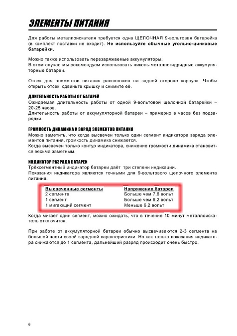 QUOTE(Metaldetector.ru @ Mar 26 2011, 14:22) А здесь: ![]() вообще все правильно - там, где Вы обвели красной рамочкой, речь идет именно о двух сегментах индикатора питания - так, как и есть на самом деле. Ув. Metaldetector.ru. Я правильно обвёл,а Вы правильно поняли.Поэтому,тремя строчками выше пишем вместо трёхсегментный , двухсегментный,а ниже,где 2-3 сегмента оставляем только 2.Третьего просто нет,а первый работает в двух режимах: свечение или пульсация. Вот и получается,что двухсегментный индикатор батареи даёт три степени индикации. Других инструкций не читал,а на Вашем сайте не нашёл. С ув. |