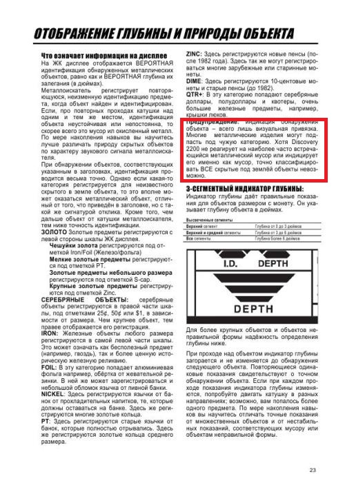 Да, были проблемы с инструкцией Bounty Hunter Platinum.Дилеры в качестве неё комплектовали приборы переводом инструкции от Technetics Gamma 6000, видимо дополненной в вашем случае вставками из инструкции Discavery 2200 .У меня инструкция вообще вся на английском была и ничего разобрался...