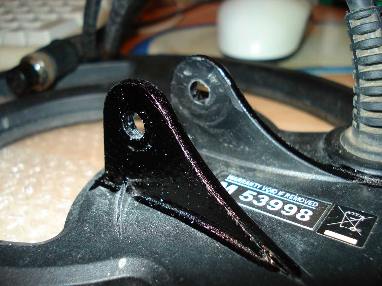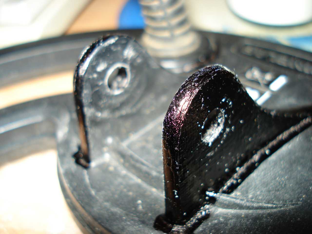 Когда в прошлом году собирался приобрести "Терку" почитал форумы, изучил все плюсы и минусы одним из которых был это слабые ушки у катушек и решился на покупку 305 й подумав про себя что проблема старая фирмачи про нее наверняка знают и уже наверно все поправели. А нет, все не так, и меня не миновала сея проблема. И главное что обидно гвозди катушкой не забивал ямы не закапывал одним словом берег, да не уберег. Ушки не оторвались а лопнули по отверстию крепежного болта. Благо вовремя заметил и собрал обломки. Склейку произвел клеем типа Космофен (циан акрилат) и про армировал тонким стеклотекстолитом толщиной примерно 0.3-0.5 посаженым на клей внахлест на все ухо. Для достижения декоративного момента все покрашено черным фломастером
