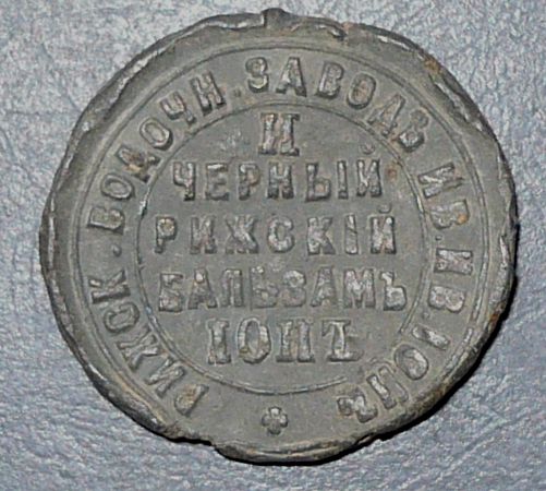 QUOTE(Большак @ Apr 20 2009, 11:29) Интересует ваше мнение? Найдена во Владимирской обл. Спасибо за фото и информацию о регионе находки! Пломба - одного из многочисленных подвариантов, пожалуй - самого распространенного типа. Круговая надпись на аверсе (вышедшая на Вашем экземпляре частично за поле пломбы) гласит: "ОДОБРЕНо МЕДИЦинским СОВЪТом ВЪ С.П.Б.". На реверсе - условная дата - "1635" - год, к которому по одной из версий возводили появление первой протобальзамной рижской рецептуры, и девиз - "БОГЪ И МОЕ ПРАВО". Полагаю, что пломба вольфшмидтовская (на этом типе это не указано), начала 20-го века, от бальзама, произведенного на Рижском заводе Альберта Вольфшмидта. Подвариант с одной звездой на аверсе (есть подварианты с двумя - над и под центральной надписью). В весьма приличном состоянии. Удачи и новых находок! -------------------- Изучаю и собираю пломбы от рижского бальзама:http://www.reviewdetector.ru/index.php?showtopic=6309