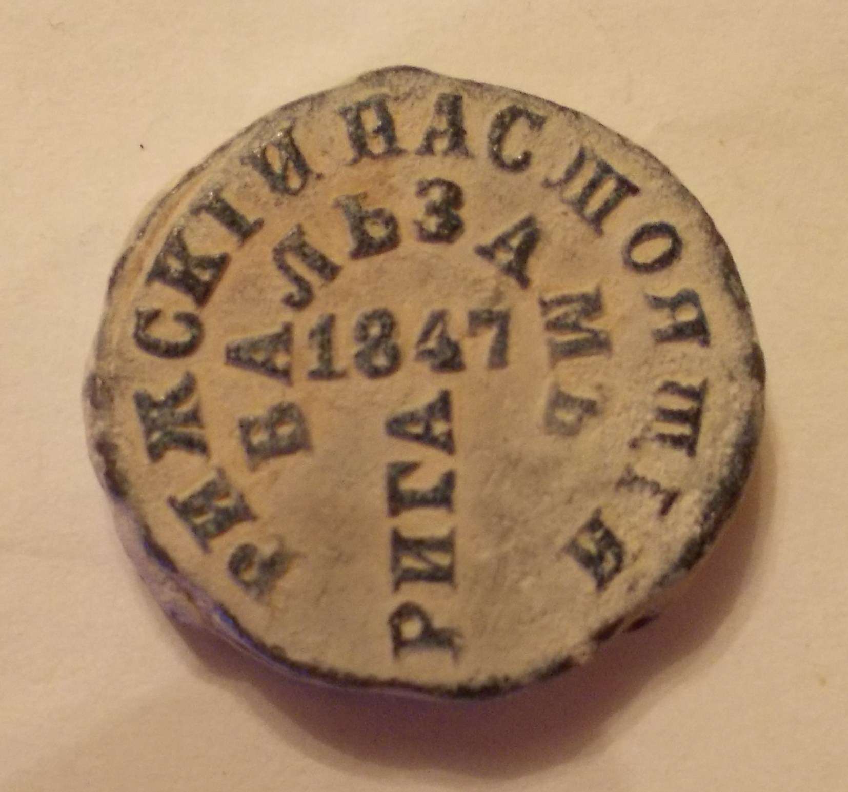 QUOTE(VladimirZ @ Jul 2 2011, 14:04) а вот такой экземляр интересен? найден на севере МО Спасибо, коллега, интересен! Отвечаю с задержкой, ибо был в отъезде. Правда, пока этот экземпляр - загадка для меня, как и композиционно однотипный с ним (даже легенды и сокращения слов совпадают), имеющийся у меня (тоже весьма убитый), но у моего другая фамилия производителя, увы, полностью не читаемая (что-то вроде ?.И.Шлипса). А в остальном оба экземпляра одинаковы, должно быть, речь идет об одном и том же заводе, но при разных собственниках. Сообщение отредактировано podolianyn: Jul 7 2011, 22:30 -------------------- Изучаю и собираю пломбы от рижского бальзама:http://www.reviewdetector.ru/index.php?showtopic=6309